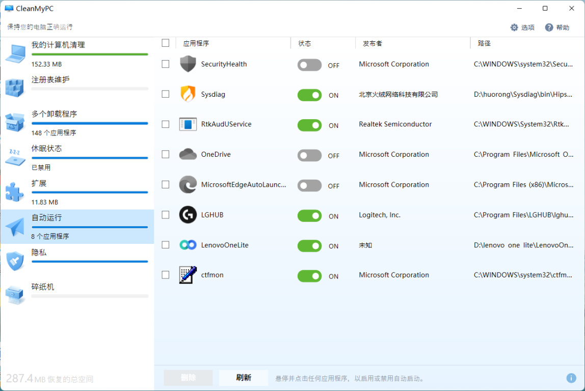 自启动管理:一些自启动程序会拖慢开机时间,这里我们可以看到哪些自启动程序,并选择关闭