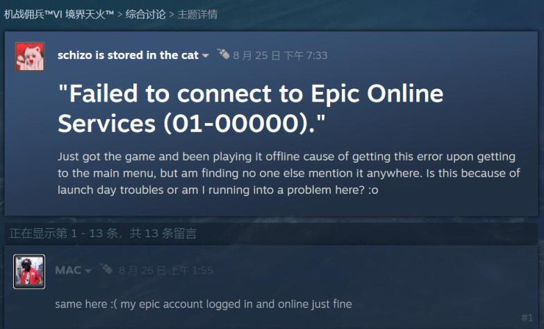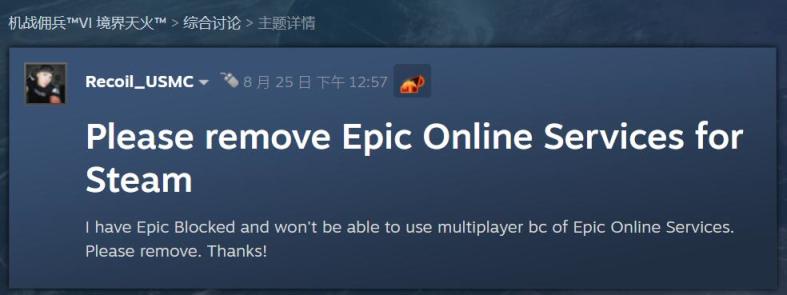 有玩家指出,《装甲核心6》不知为何使用了Epic网络服务,他们对此感到很疑惑,因为这款游戏并未登陆Epic平台。还有的玩家因为连不上这个服务而无法联网游戏、只能离线游玩《装甲核心6》。