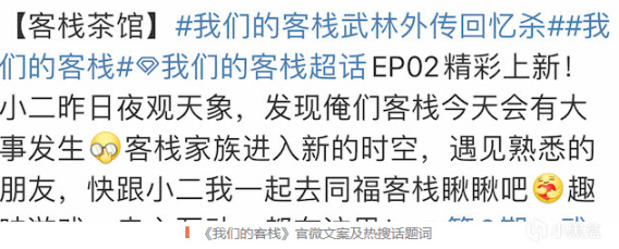5.在社交媒体端多次使用“《武林外传》回忆杀”、“梦回武林”、“《武林外传》杀青宴”等宣传文案;该节目于WB建立了多个嘉宾名+《武林外传》角色名的互动话题并登上热搜。