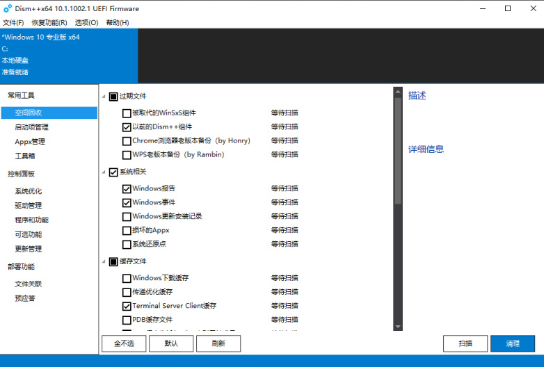Dism++体积较小功能较多且强大,自动找出可清理文件。