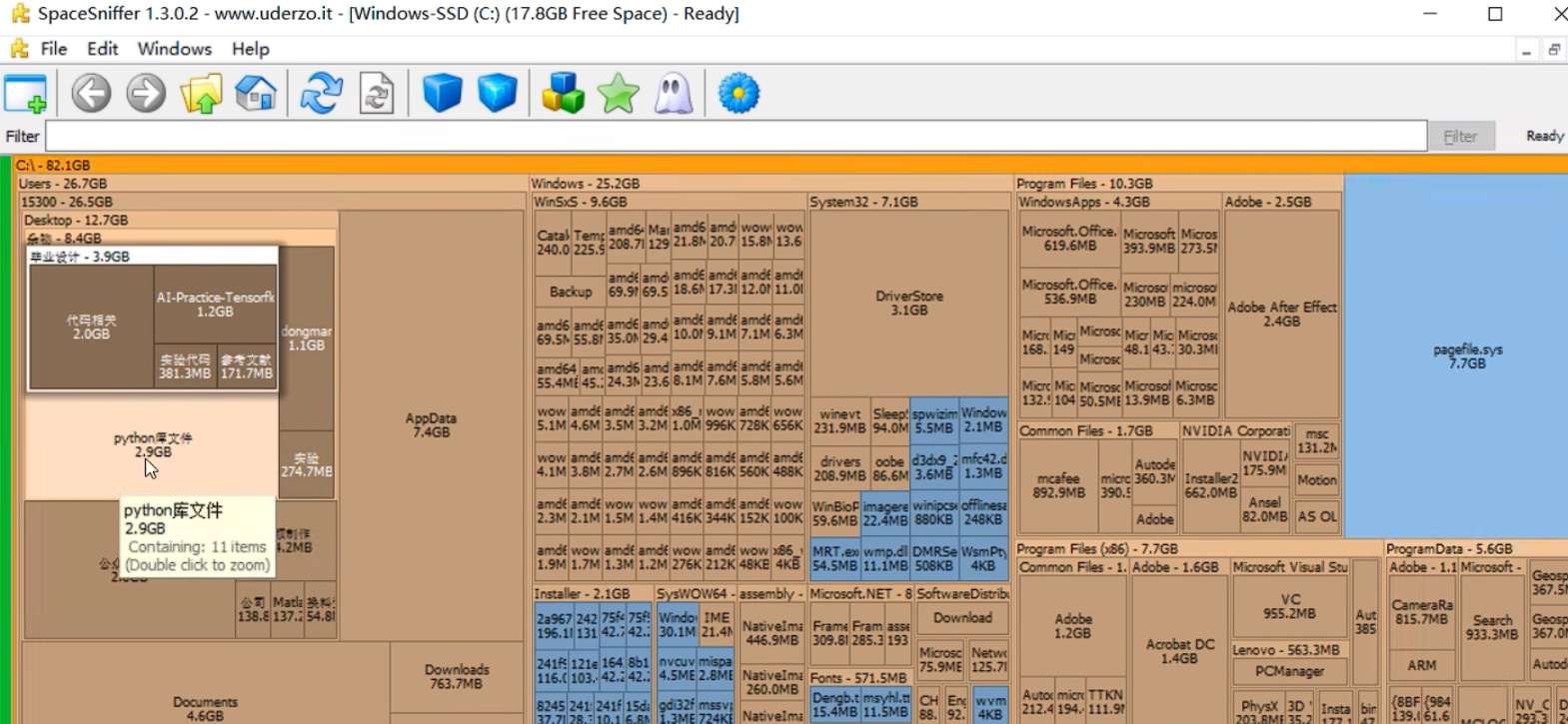 SpaceSniffer分析并直观展现磁盘空间占用情况,根据情况选择清理。
