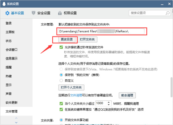 例如:QQ 设置→下翻找到文件管理→更改文件保存目录