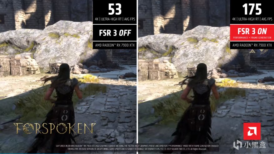官方PPT上《魔咒之地》在4K分辨率下,開啓FSR3.0後,幀數從53幀漲到175幀。也得益於這項技術不借助AI單元,所以很多顯卡都能用。