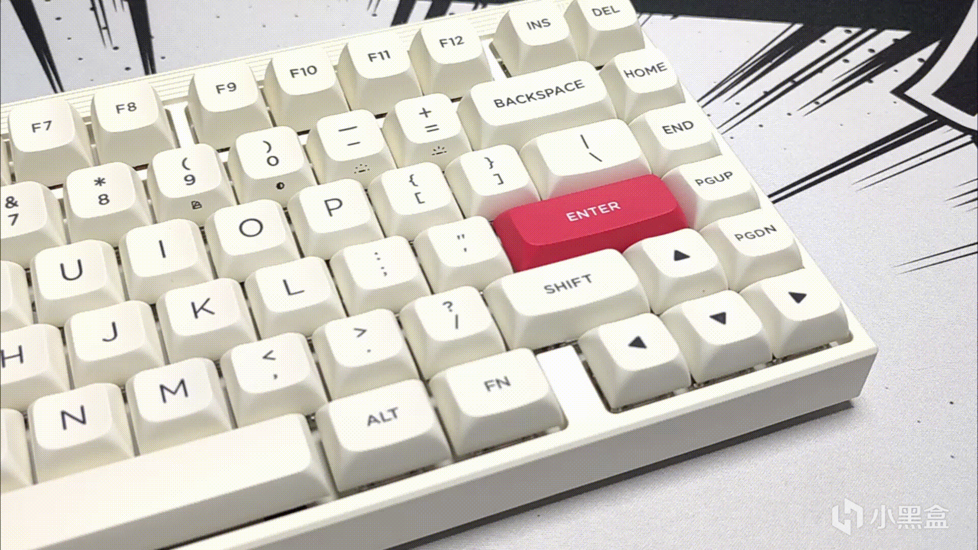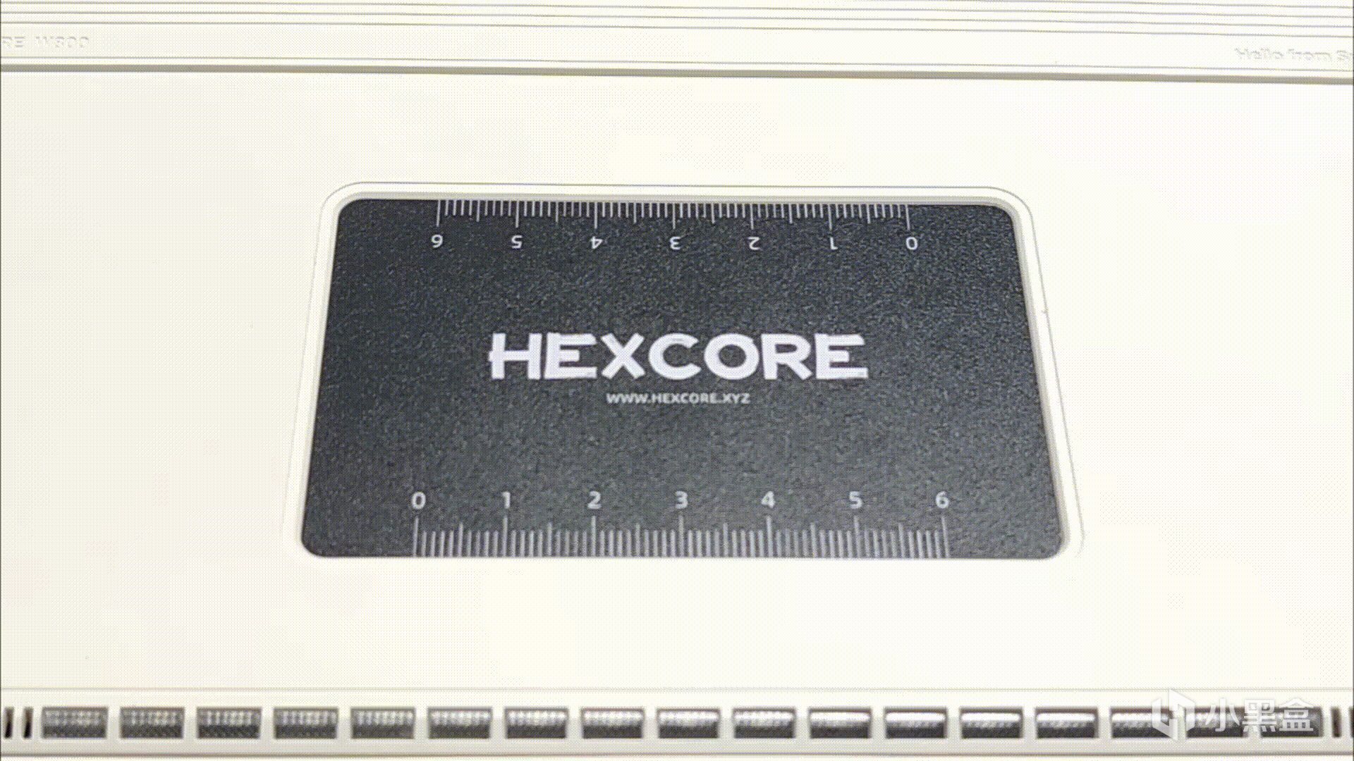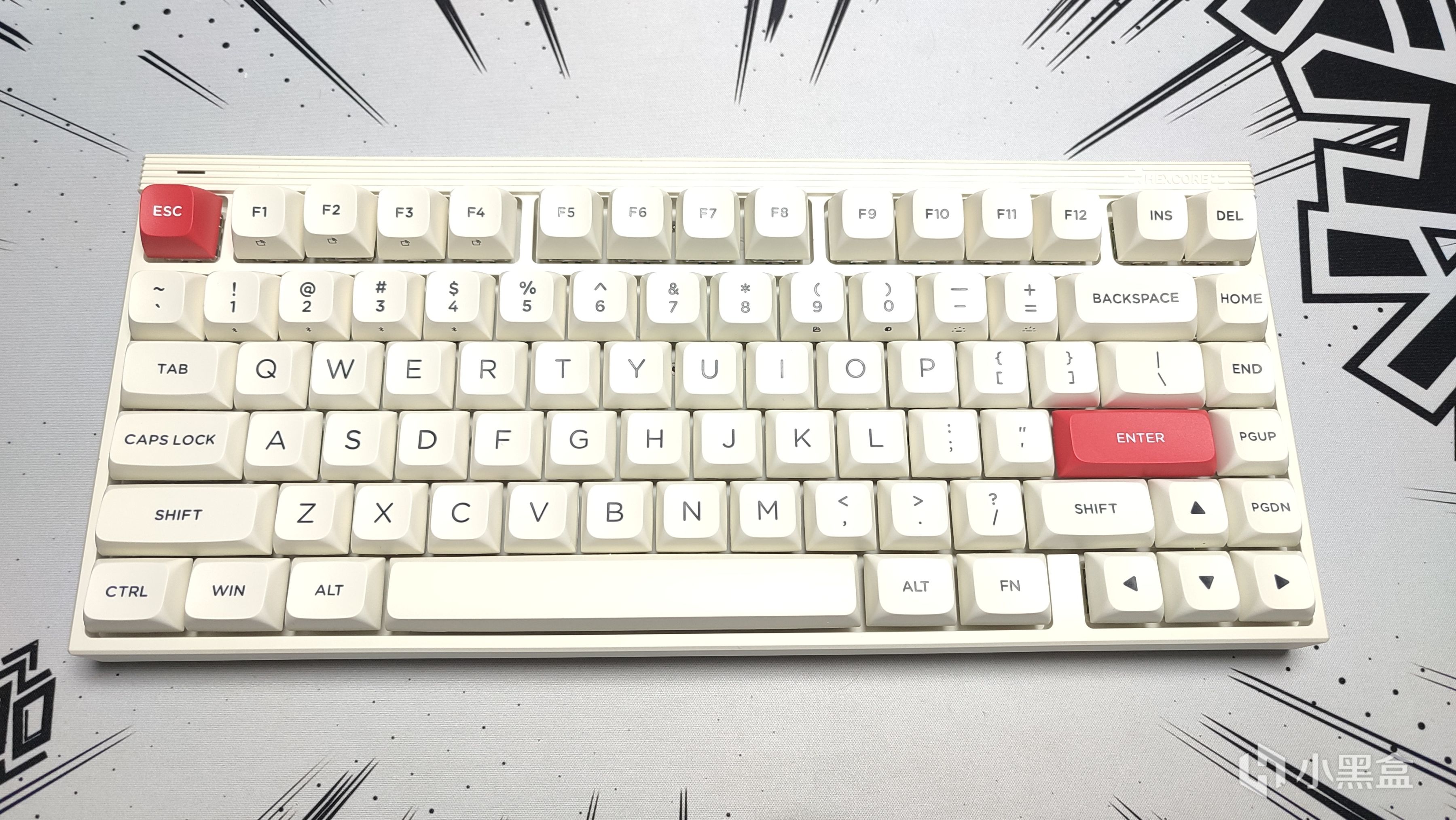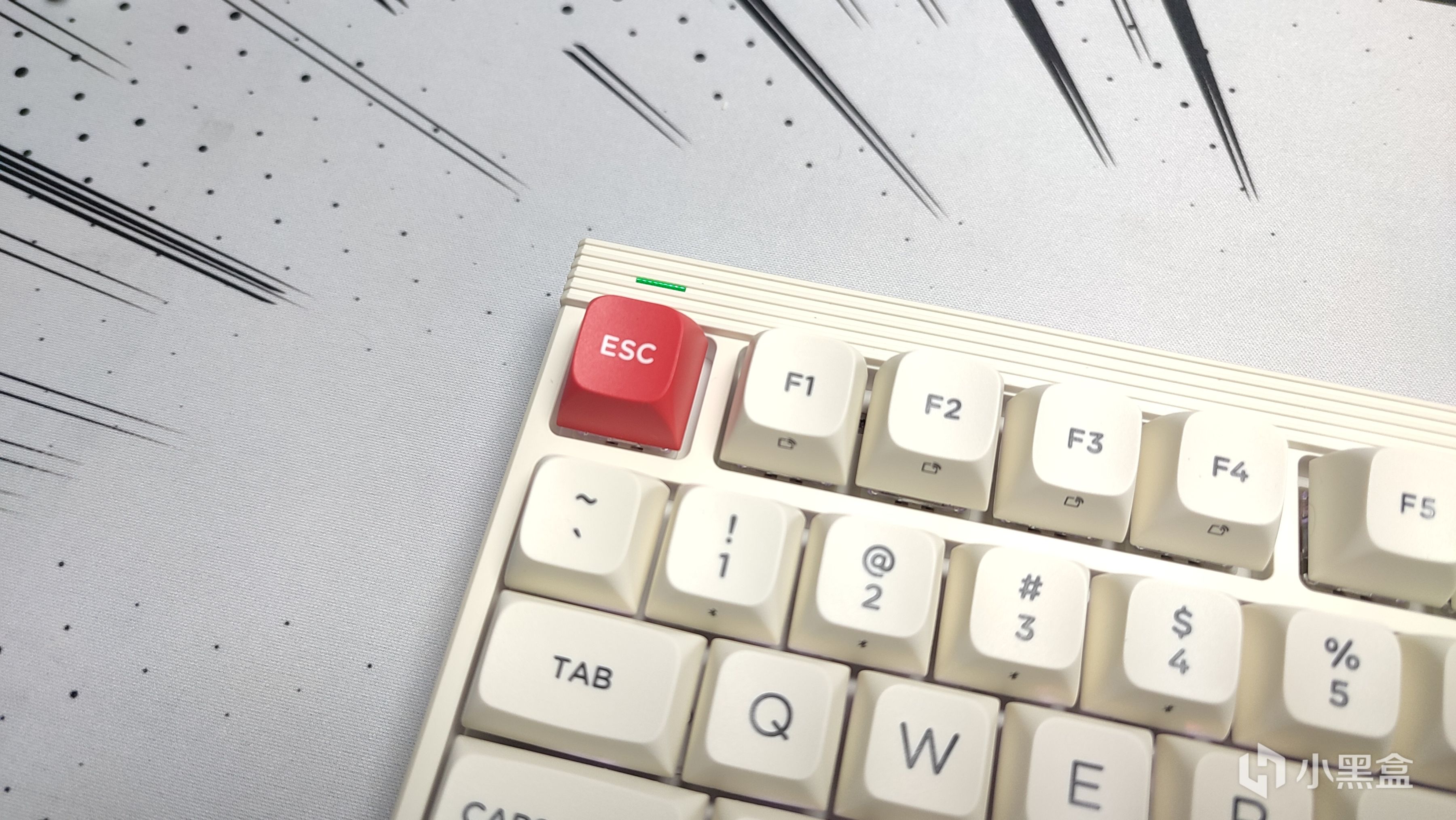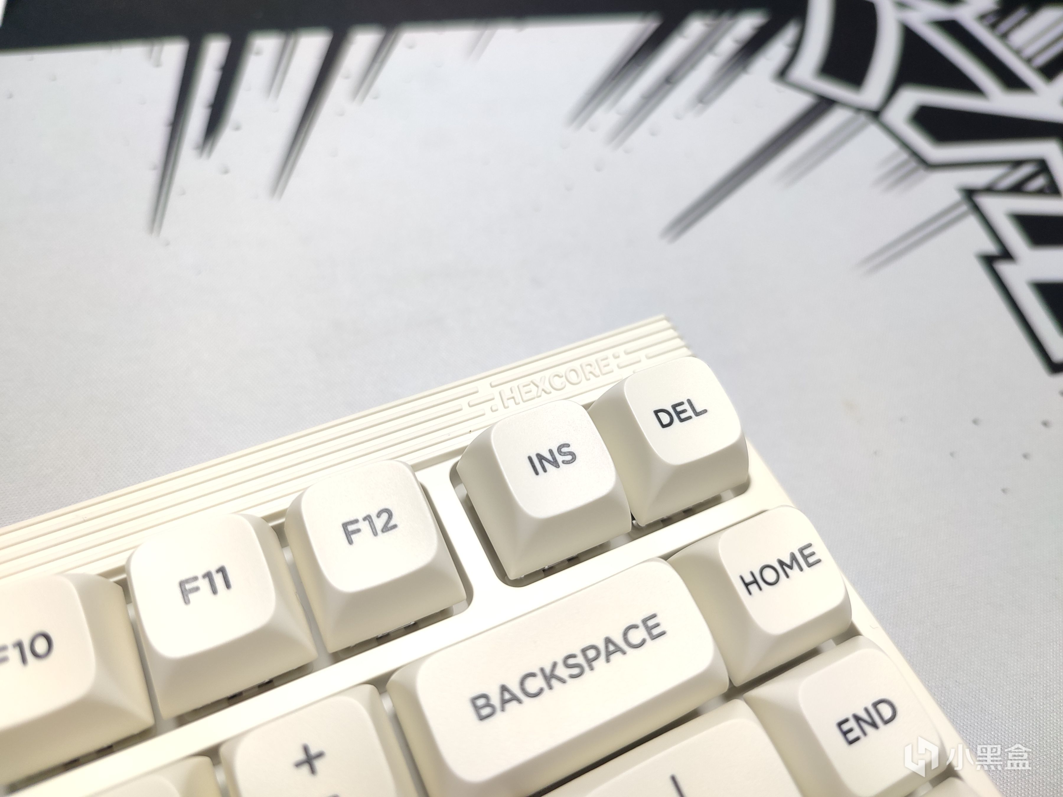 在鍵盤正面的最頂部,能看到多了一層條紋狀的裝飾,右側位置能看到HEXCORE的品牌名,左側就是鍵盤的指示燈,這個指示燈在默認情況下還會跟着打字節奏變換顏色,很好玩。在驅動中也可以設置對應顏色的指示燈,比如我設置的就是亮起紅色的時候代表大寫開關打開。