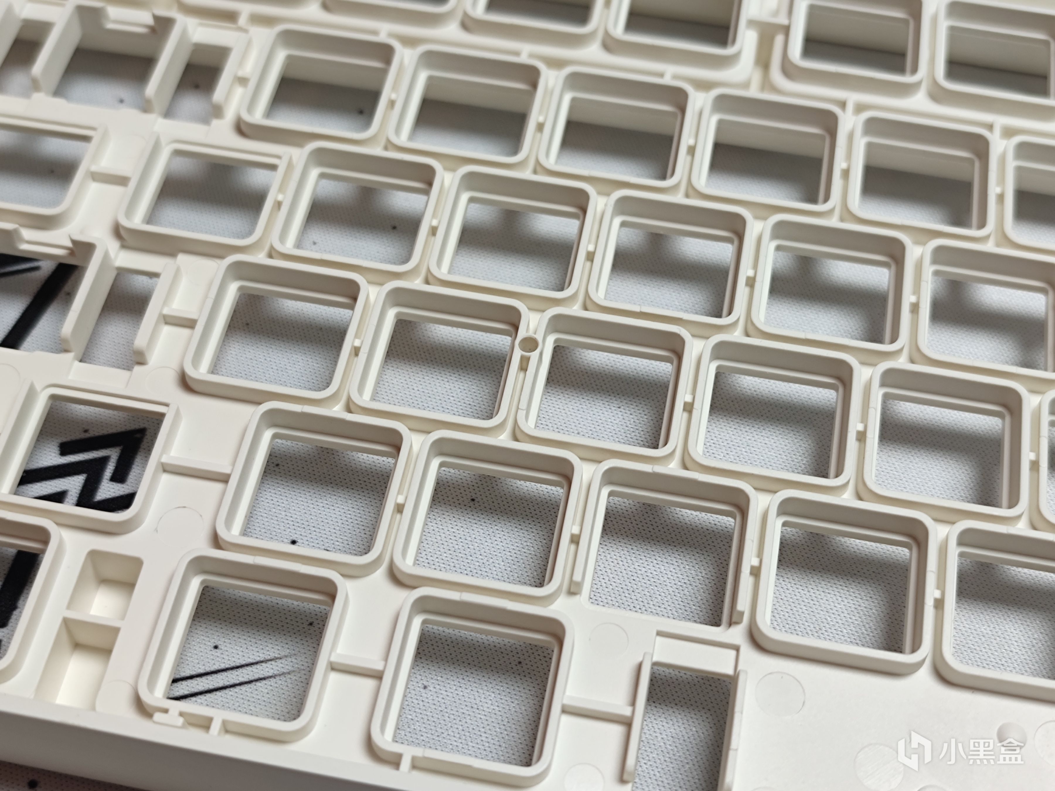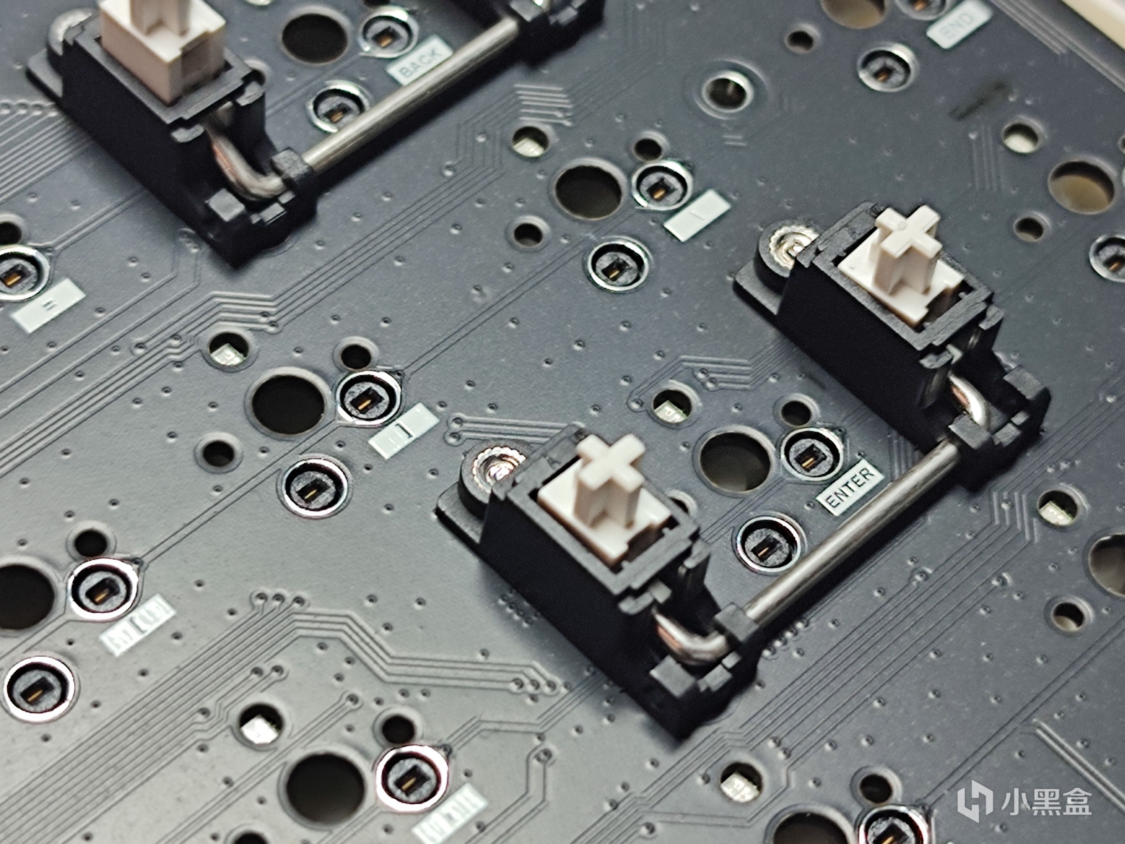 上蓋和定位板一體,這一點前面也說過了,所以不出所料的是塑料材質定位板;但是和以往介紹的那些鍵盤不同的是,這把鍵盤採用的是佳達隆的PCB衛星軸,最主要的區別就是固定方式不是通過卡扣卡到定位板上,具體差別其實也不大,如果有人感興趣可以單獨開一期細講。