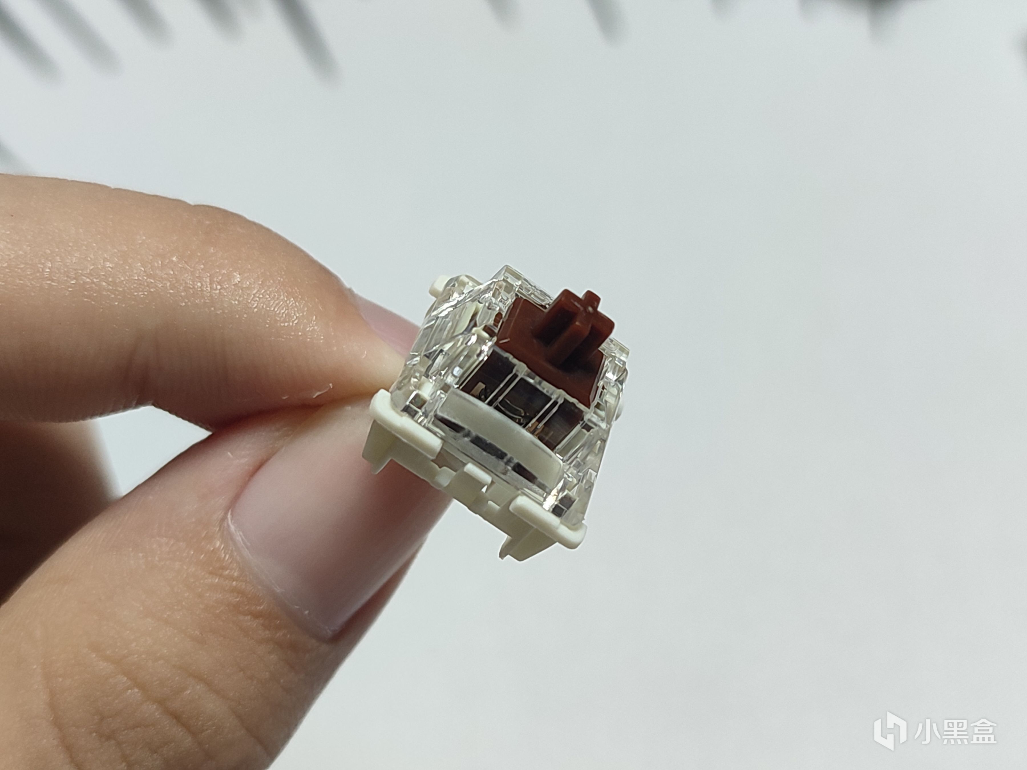 將軸體單拿出來看:G茶pro3.0採用的是pc高透上蓋,軸芯和底殼看不出來,不過按照這個系列的特性依舊是PC上蓋+POM軸芯+尼龍底殼。整體採用十字軸芯和三腳底殼的配置,不過出乎意料的是晃動程度還行,也許是因爲鍵帽高度不是很高的原因。