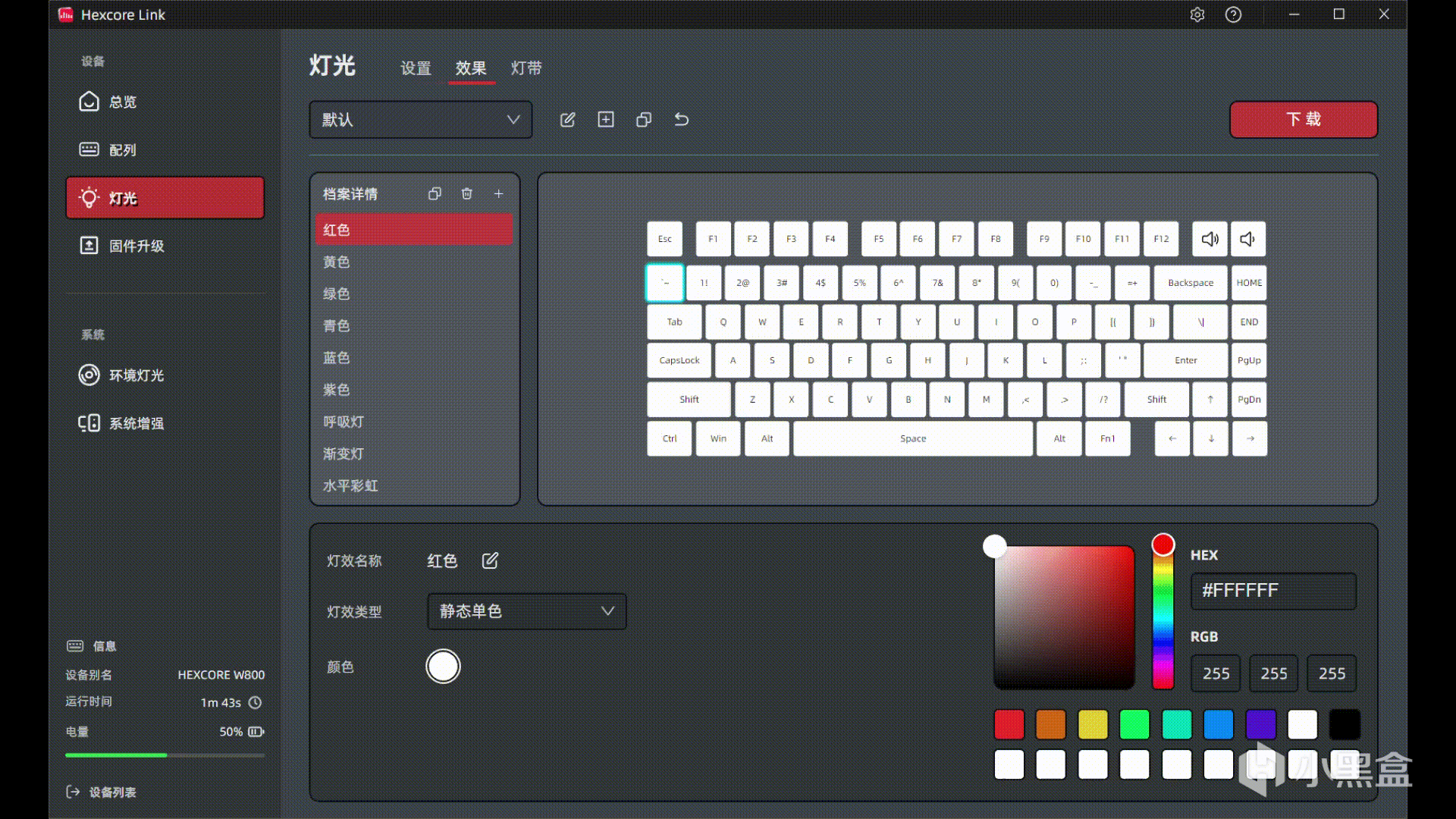 接下來就是正式介紹驅動了,從剛纔的頁面大家也能看出來W800採用的並不是國內方案廠通用的驅動頁面,也是單獨研發的一款全新驅動,從視覺效果上就能感覺出很明顯的差別,整體的動畫流暢度以及反應速度也是極爲優秀的,這一點還值得國內鍵盤廠商好好學學。