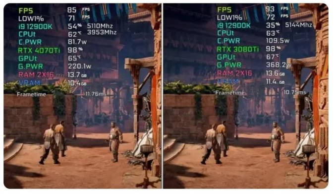 RTX 4070 Ti只是在CPU和GPU利用率上更優,部分遊戲幀率上略領先幅度約5-10%。而RTX 3080 Ti幀時間只有對手一半,達到了極低的11.6ms延遲,重減負優化戰力爆發。在平均幀率、最低幀率等指標上,兩者不相上下,均保證流暢畫質。整體而言,RTX 4070 Ti以更優秀的功耗表現略勝一籌;但純粹論遊戲體驗,RTX 3080 Ti的低延遲反而比4070TI強,價格還低個千把塊,我有什麼理由去買4070TI??