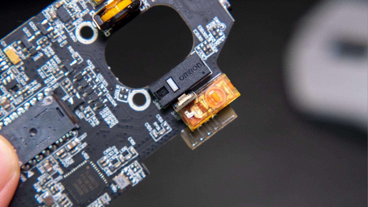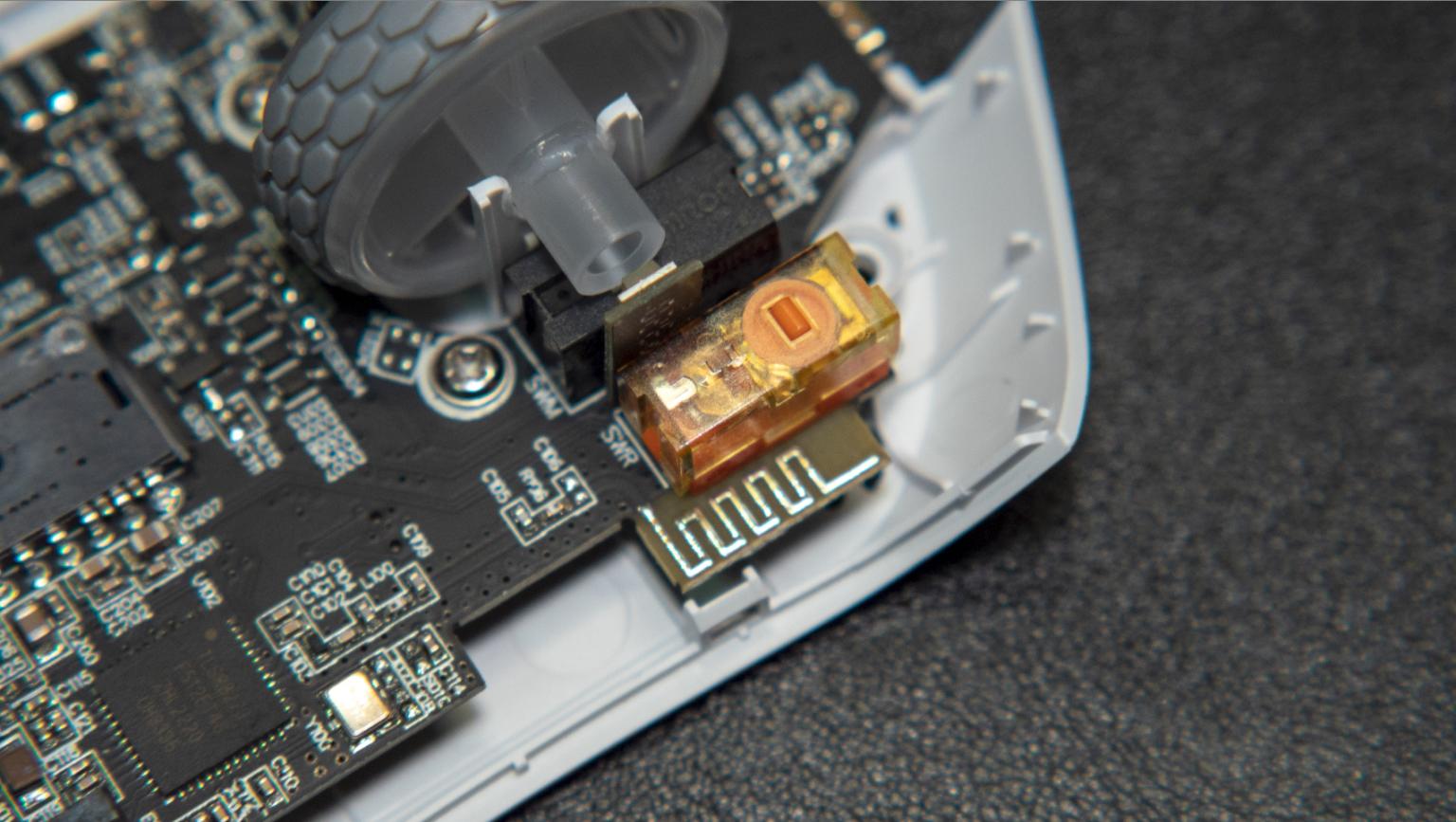 鼠標微動採用TTC金微動,6000W次壽命,手感軟脆。在微動旁可看到蛇形天線,用來增強鼠標無線連接時的穩定性。