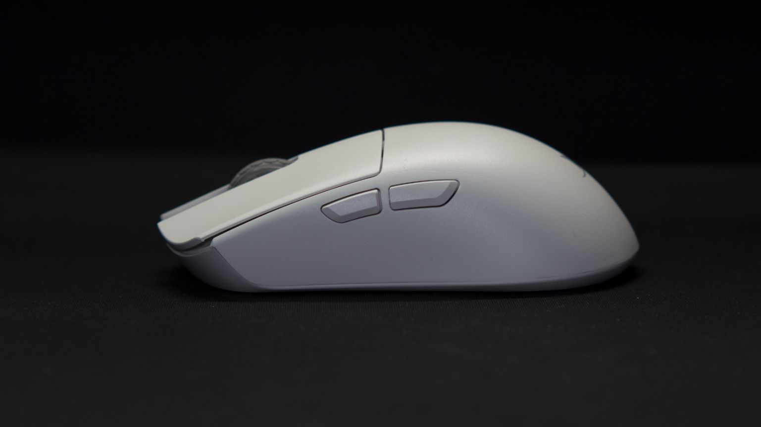 從側面圖可以看出,達摩鯊M3s 的模具設計思路和ROG龍鱗ACE高度相似。在握感上,兩款鼠標都是有強烈頂手心感的抓握鼠。鼠標最高點均在正中央偏後的位置上,側鍵則被設計在以主鍵尾端接縫處。