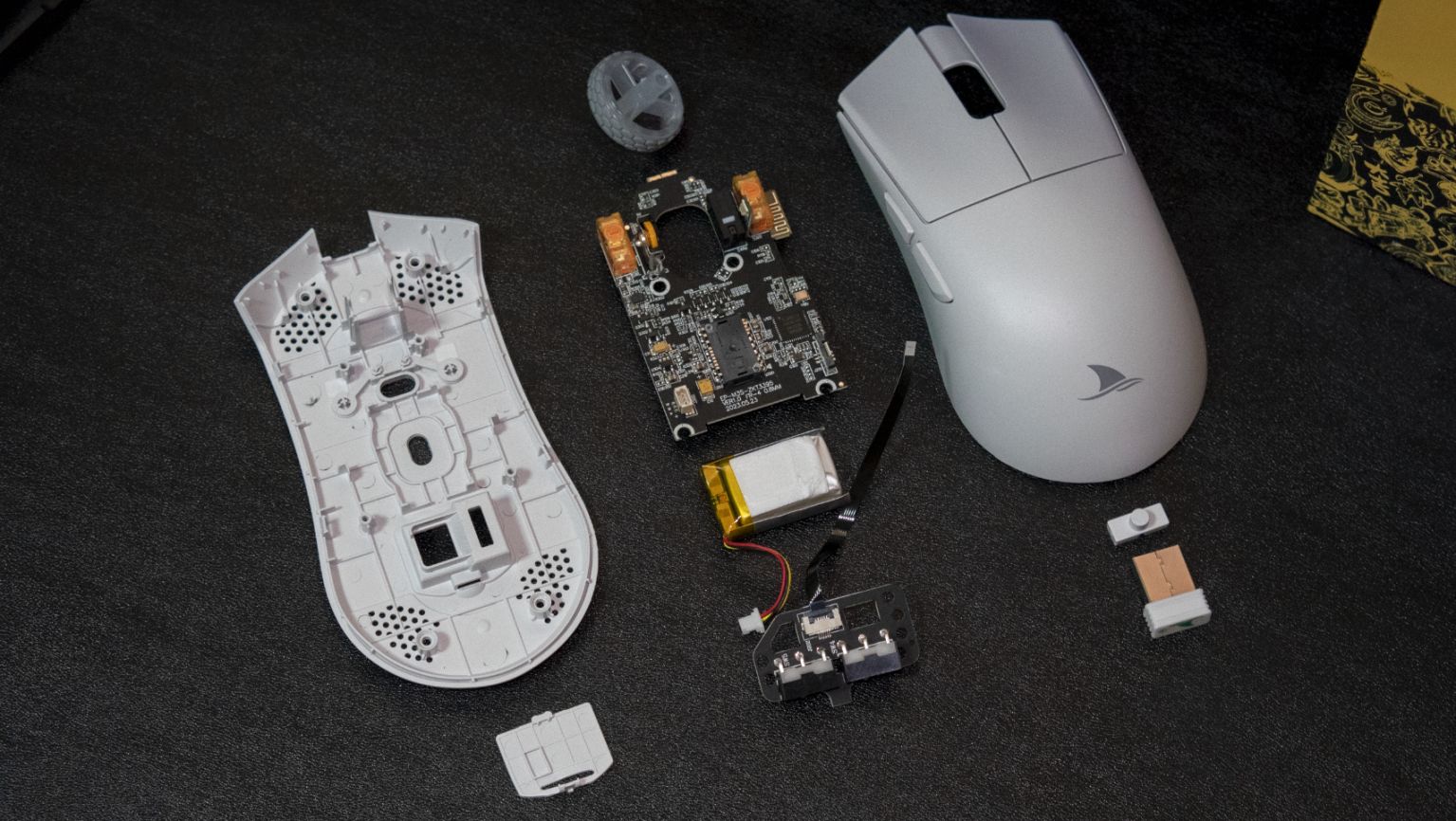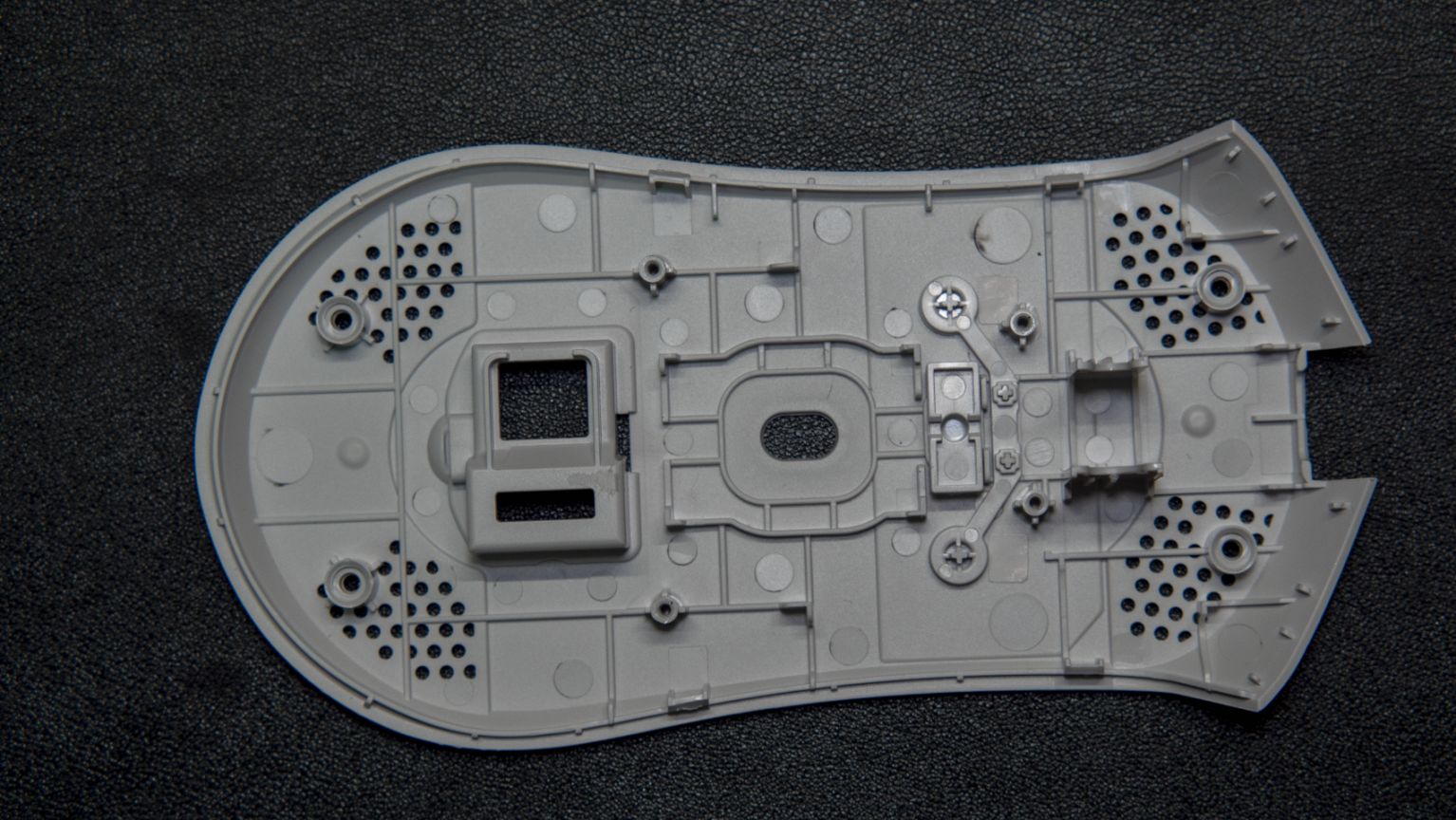最後來看鼠標的拆解,撕開底部兩個角貼,可以看到鼠標通過四角的螺絲固定,擰下螺絲即可打開鼠標。腳貼下有細密減重孔,減輕鼠標重量的同時也能起到平整腳貼作用。