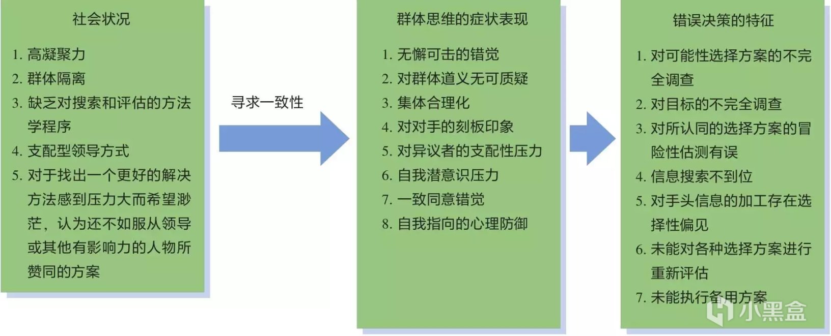 群体思维的弊端:群体对和睦一致的渴望要求可能会压倒对相反观点的真实评价。特别是当群体成员强烈地渴望统一性,或是他们与相反的观点相隔绝,又或是领导暗示了他或她本人的意愿时,这表现得尤其突出。