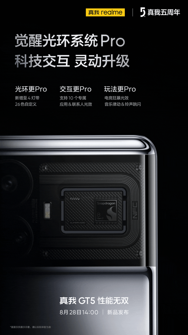 其他方面,realmeGT5支持三频GPS+四频北斗,支持Wi-Fi 7协议,支持UFCS融合快充觉醒光环系统 Pro,4灯带支持26色自定义。