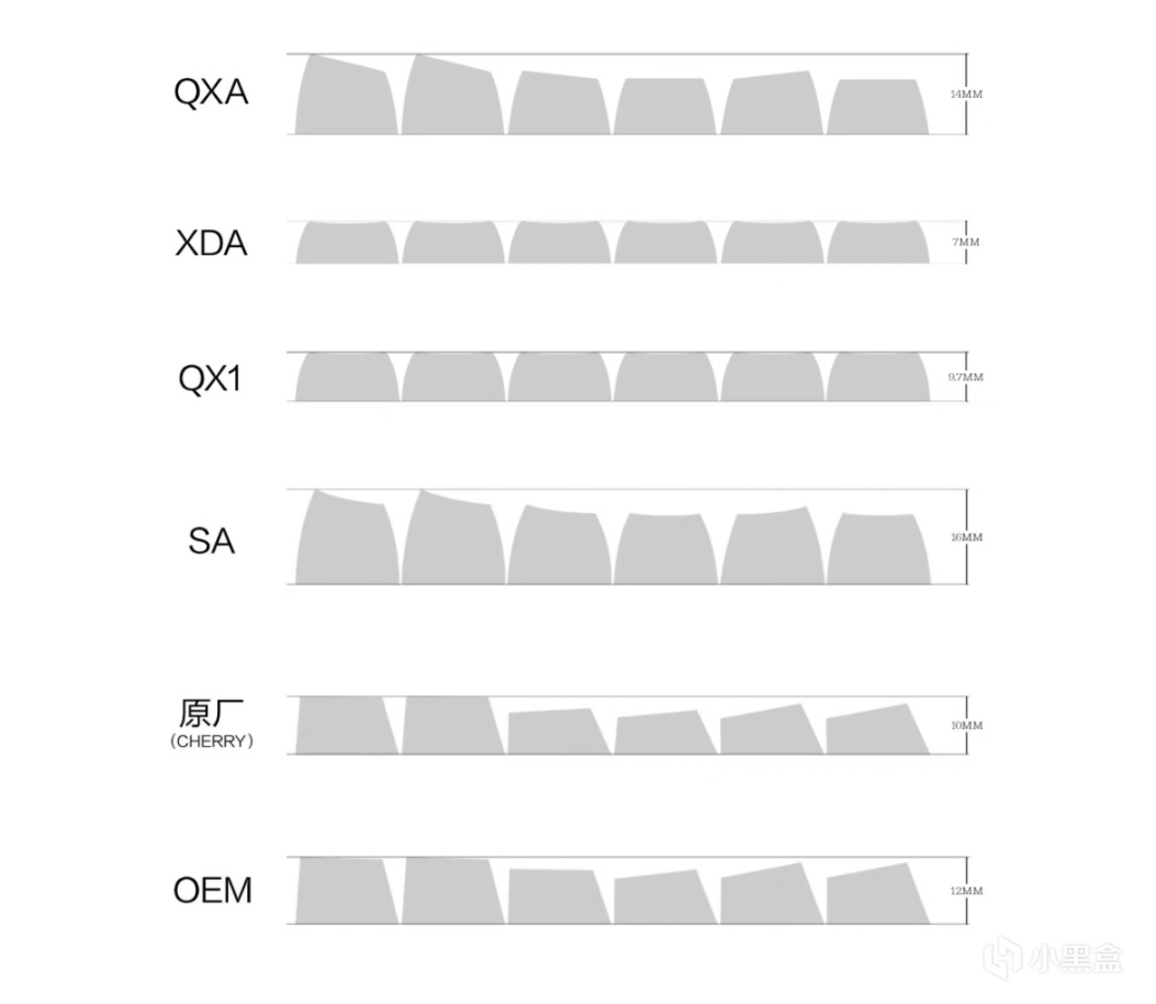 常见的键帽高度分为:OEM高度,SA高度,cherry原厂高度,xda高度;当然了现在又冒出来了很多奇奇怪怪的高度,什么mda啊dsa啊,oma啊好多好多,导致我有点分不清了,但是我还是喜欢原厂以及sa高度键帽