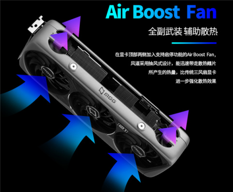 它的散热系统还是Meg Freeze VC,正面是三个10厘米直径的大风扇,均为11片扇叶,顶部左右两侧各有一个小号的Air Boost Fan,轴风式设计,可进一步加强散热效果,而且同样支持智能启停。