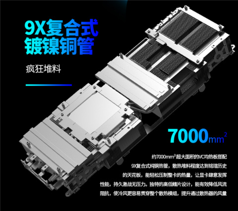 此外,该卡还配备了9条复合式镀镍铜管、7000平方毫米VC均热板、ADC12纯铝全包裹整流罩、金属背板,疯狂堆料到了极致。