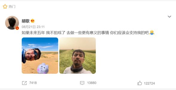 胡歌曾在8月21日发文表示自己如果五年内不再拍戏,想去做些有意义的事!