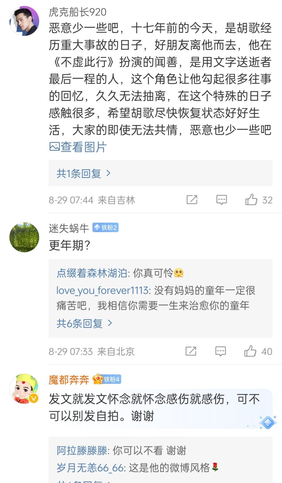 我个人觉得网友的恶意,能不能别这么大,而且人家哪里占用公共资源了,人家自己的微博发什么也是别人的自由,再说了,还不准别人emo一下吗?明星也是普通人,希望胡歌早日找回状态,我个人感觉明显有点yyz(包括精神状态也是不太好)可千万别想不开!