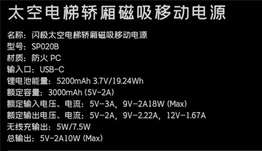 据悉,闪极太空电梯轿箱磁吸充电宝电池容量为5200mAh,支持USB-C 20W有线充电,拥有高达10N吸力,相当于可吸附吊起1kg重物。