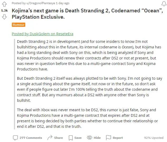 根据一位名叫DuskGolem用户的说法,《死亡搁浅》续作正在索尼的协助下积极开发。其内部代号为“Ocean”(海洋),将是PS独占作品。