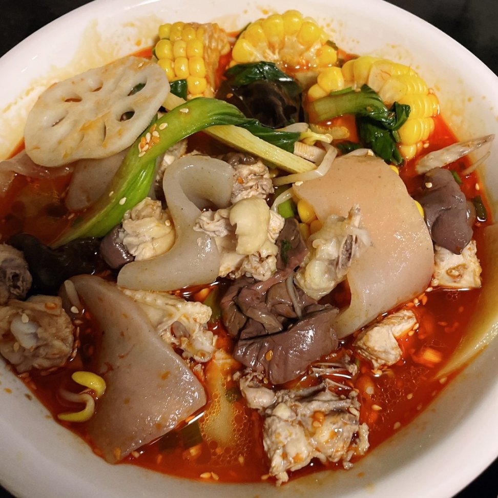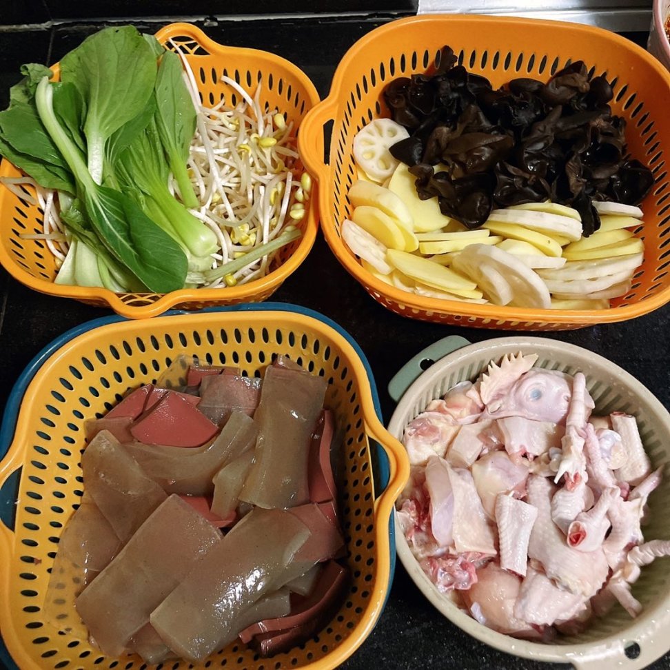 食材:钵钵鸡调料(随便哪个牌子都行,比较讲究的可以自己熬鸡汤做底)、三黄鸡、木耳、土豆、莲藕、魔芋、鸭血、豆芽、小青菜