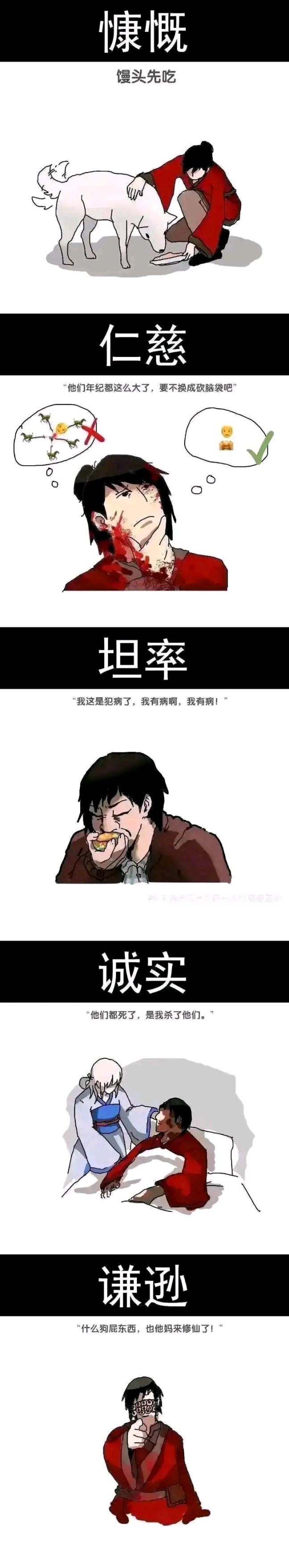 在小说中李火旺多次被坐忘道破防,以至于让主角杯弓蛇影看人就觉得可能是坐忘道,甚至让李火旺几次为了确认他人是否是坐忘道而强行“看脸”。后来坐忘道们合伙哄骗李火旺,让李火旺认为自己其实是坐忘道中名为红中的成员,甚至坐忘道的司命直接给李火旺塞了一段红中的记忆与经历。不得不说,坐忘道在书内书外都是相当的出彩,这本书的热度也少不了“坐忘道”们的参与。当恐怖的邪祟存在们随着故事的进展不再让人觉得诡异神秘,坐忘道的出现就很好的调和了神秘感的缺失,混乱的世界依然让书内的角色与书外的读者不断的猜疑,不断的草木皆兵。神经质的内核因为坐忘道的存在得以维持,直到结局的到来。