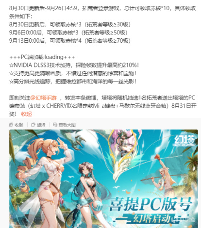 目前《幻塔》PC端已經來了,值得一提的是,在獲得版號後,《幻塔》還小小的預告了一波PC端的優勢,那就是“探險幀數提升最高約210%”。另外《幻塔》已經爲大夥準備好了福利,簡單粗暴的限定10連抽以及限量的抽獎活動,移動端也可以領取!