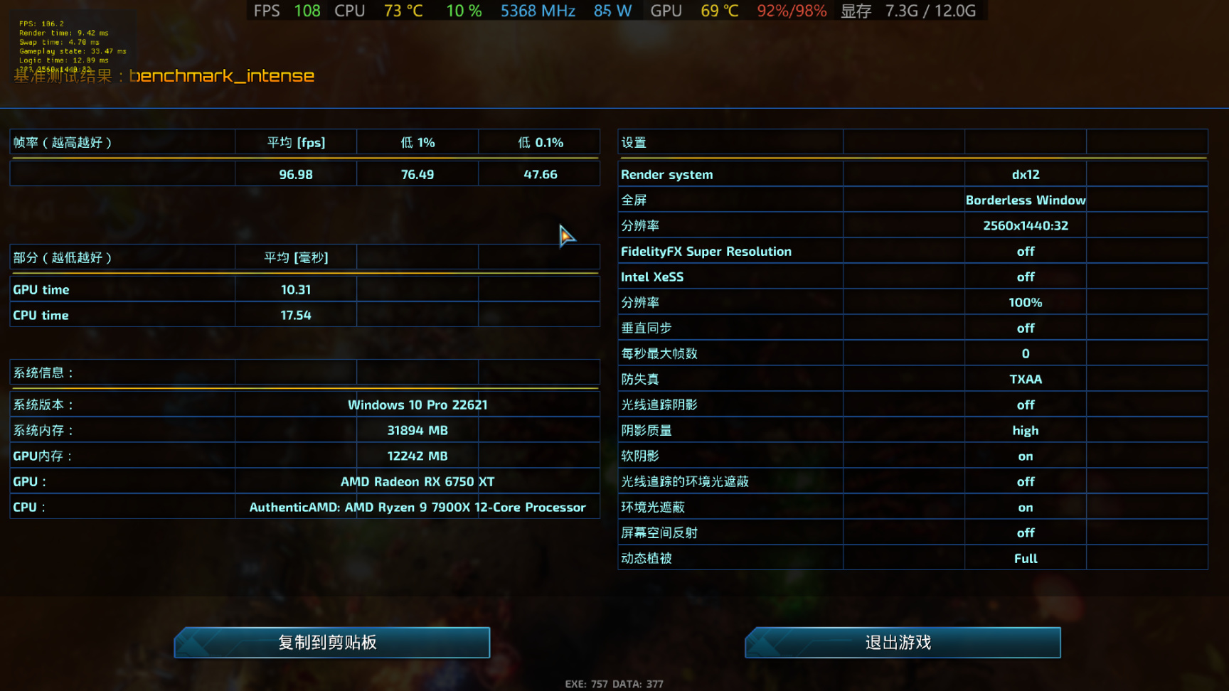 平均97帧/秒,GPU time:7=10.31/毫秒,CPU time:17.54/毫秒,可以流畅的运行该游戏。