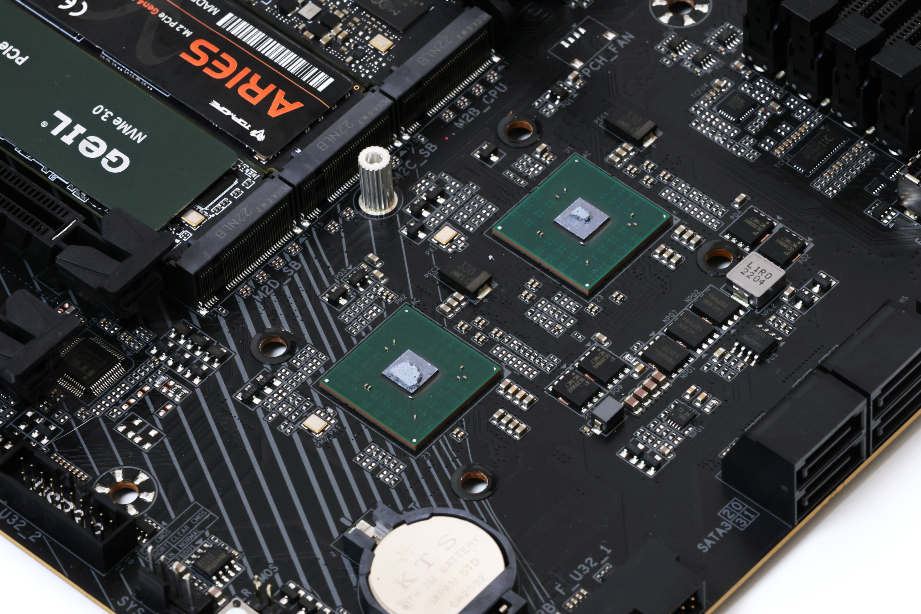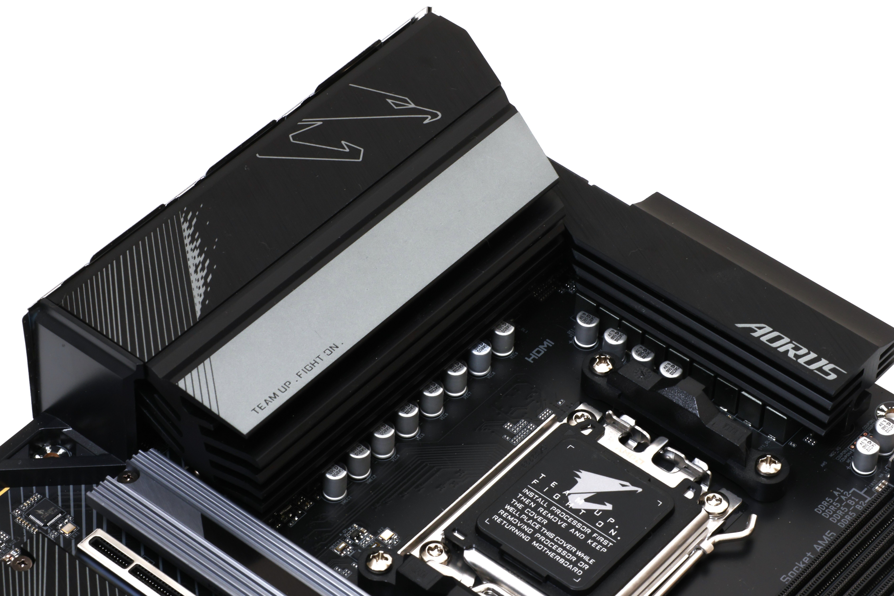 四个M.2插槽均有散热装甲覆盖, 接近CPU的M2插槽为单独的散热片,支持PCIE5.0协议,下方三个M2插槽公用了一块超大的散热装甲,支持PCIE4.0协议,上方两个M2插槽为CPU直连,下方两个走主板FCH芯片组。