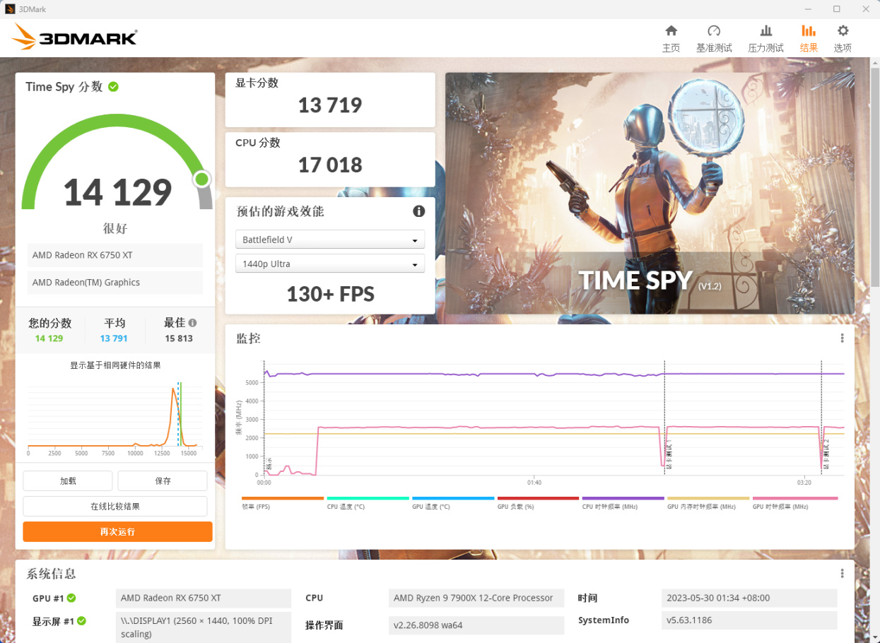 Time Spy分数:14129,CPU分数:17018,显卡分数13719分,与3070显卡跑分基本一致。