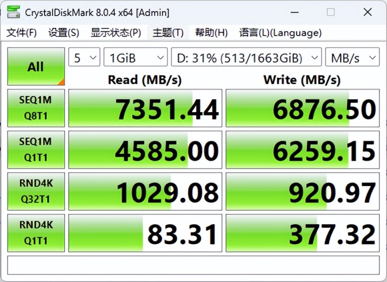 性能方面:拥有高达7300Mb/s的读取速度,6850Mb/s的写入速度,搭载DDR4L 2GB缓存。