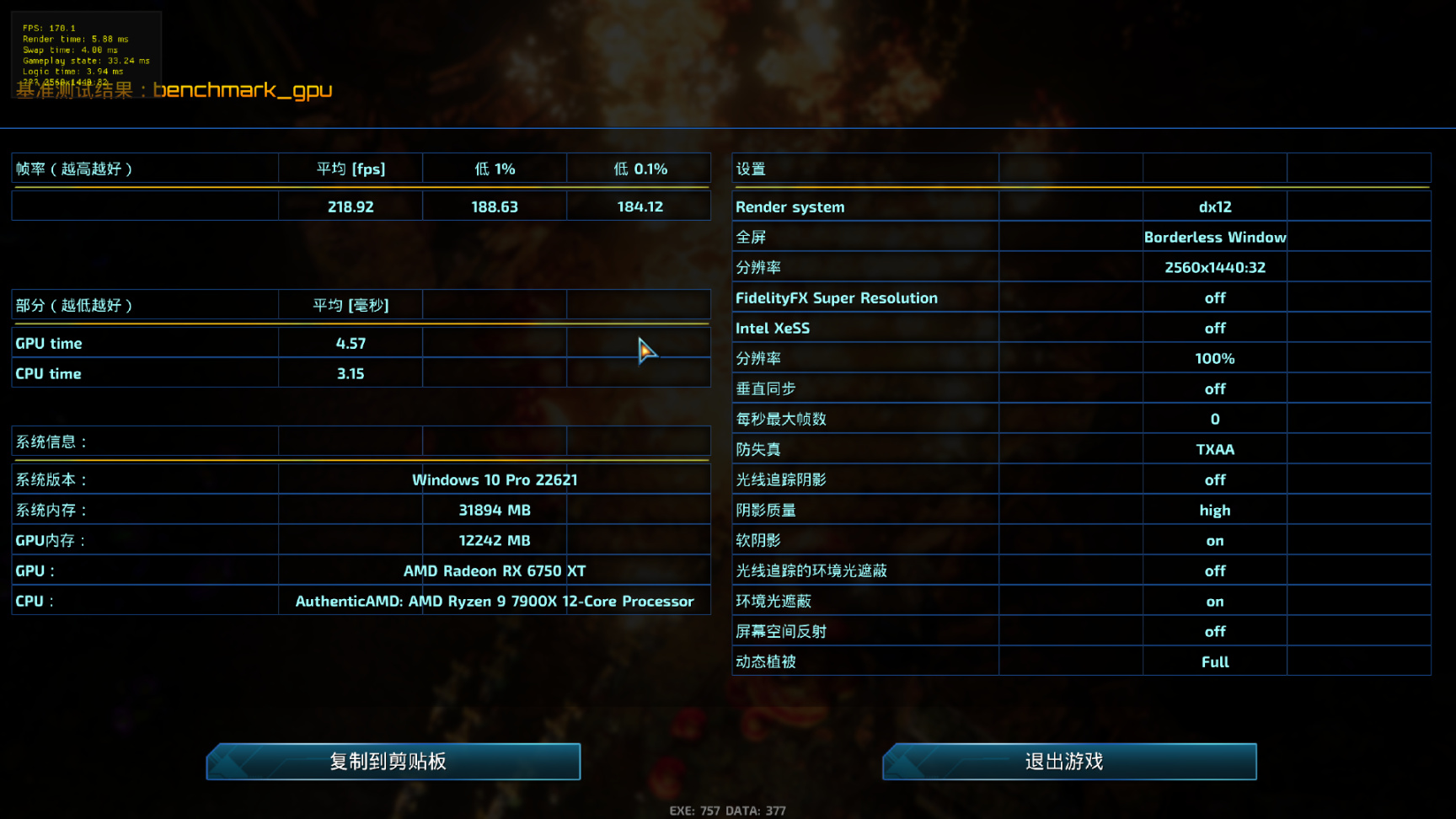 平均218帧/秒,GPU time:4.57/毫秒,CPU time:3.15/毫秒,可以流畅的运行该游戏。