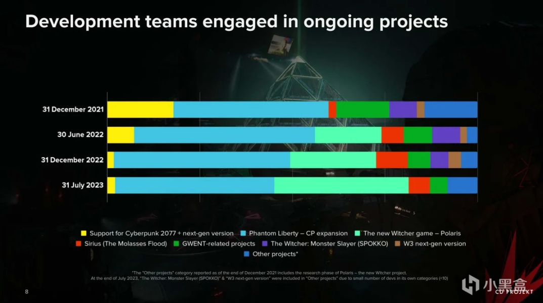 另外,在财报中CDPR首席执行官 Adam Kiciński表示:“虽然目前公司的重心依然是《往日之影》,但是预计在9月26日《赛博朋克2077 往日之影》发售后,CDPR将会把公司大部门的人员都转移至'北极星'参与《巫师》新游戏。只会留下少部分人员进行后续的维护和小规模更新工作。”