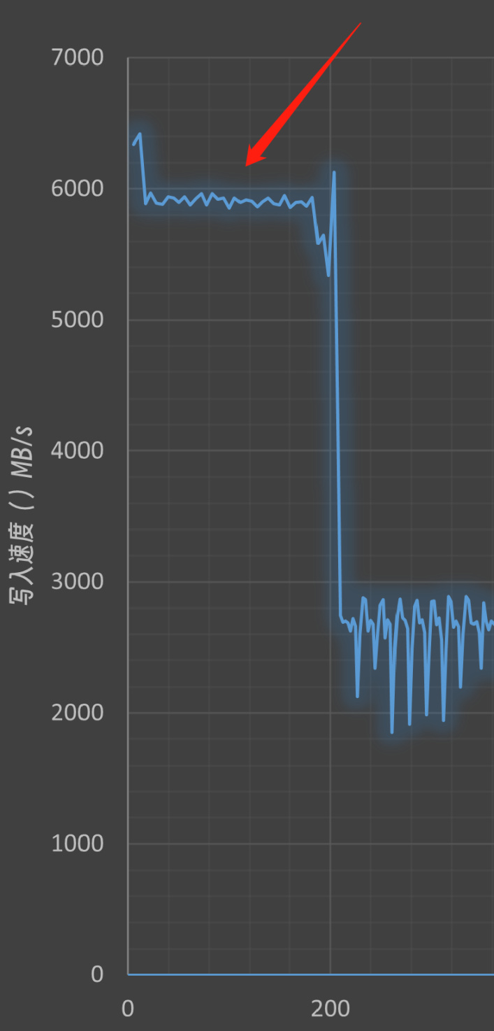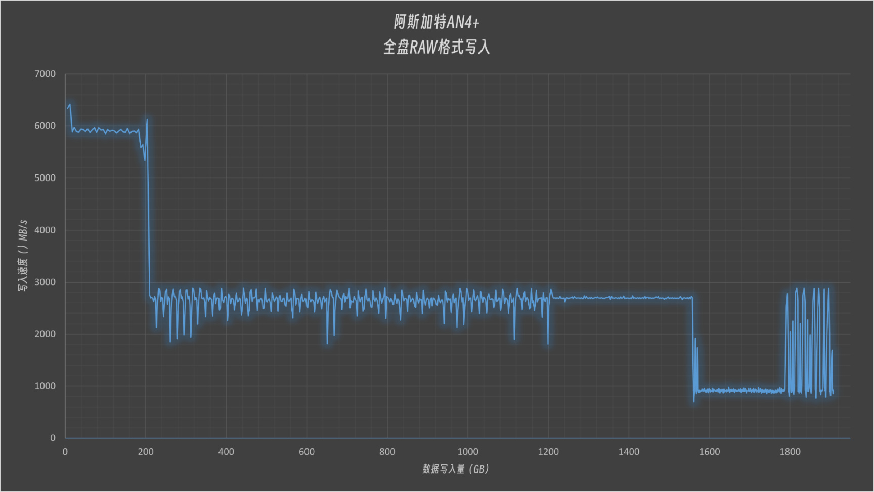 从这张绘制出来的写入曲线我们可以看到,阿斯加特AN4+的整体写入方案依然是国产HMB SSD的经典三段式结构。