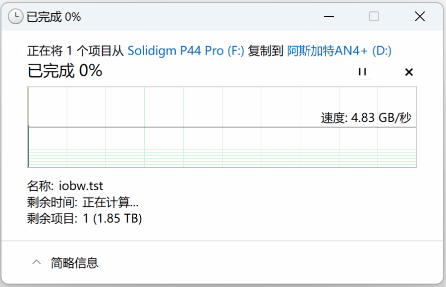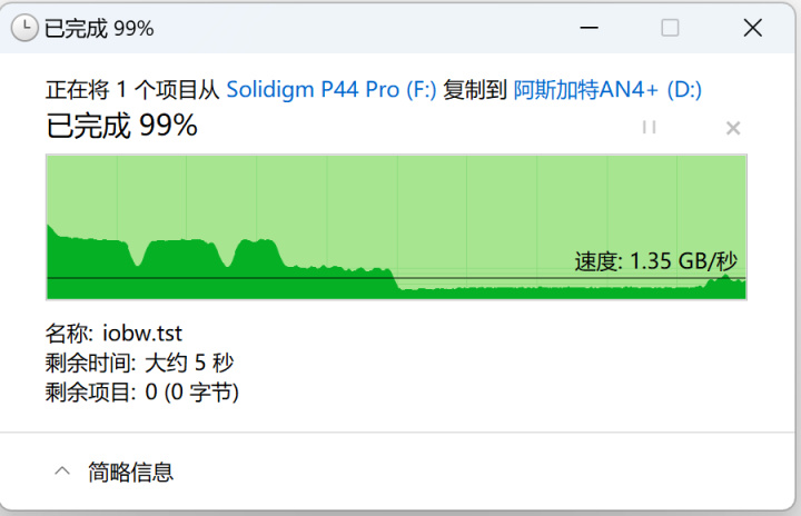 向阿斯加特AN4+拷入1.86T的大文件,其实际曲线趋势也与TxBench的测试结果类似。