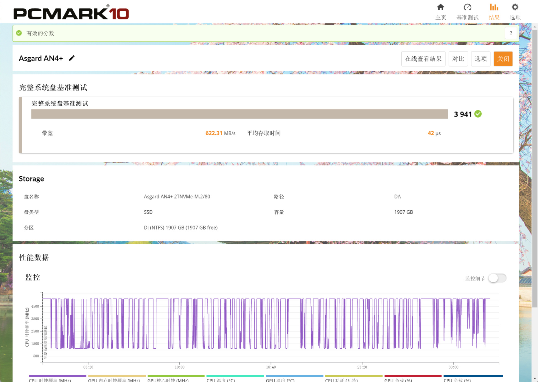 阿斯加特AN4+的测试得分为3941分,平均带宽为622.31MB/s,平均存取时间为42μs,这在我测试过的一众国产SSD中是相当优秀的成绩了。