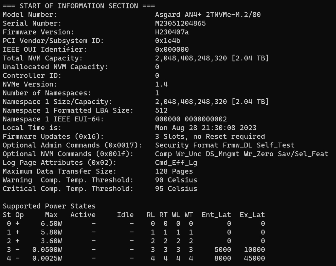 用smartmonools查看一下更多的信息,可以看到这块SSD的活跃功率定的是比较低的,更低的功耗也带来了更低的发热,这是HMB无缓盘的独家秘诀之一。