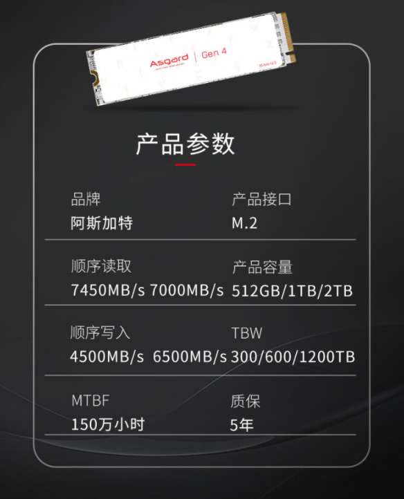 阿斯加特AN4+的官方标称的顺序读取速度为7000MB/s,顺序写入速度为65000MB/s。在质保方面则是和致态TiPlus一样的5年质保+1200TBW的标准。