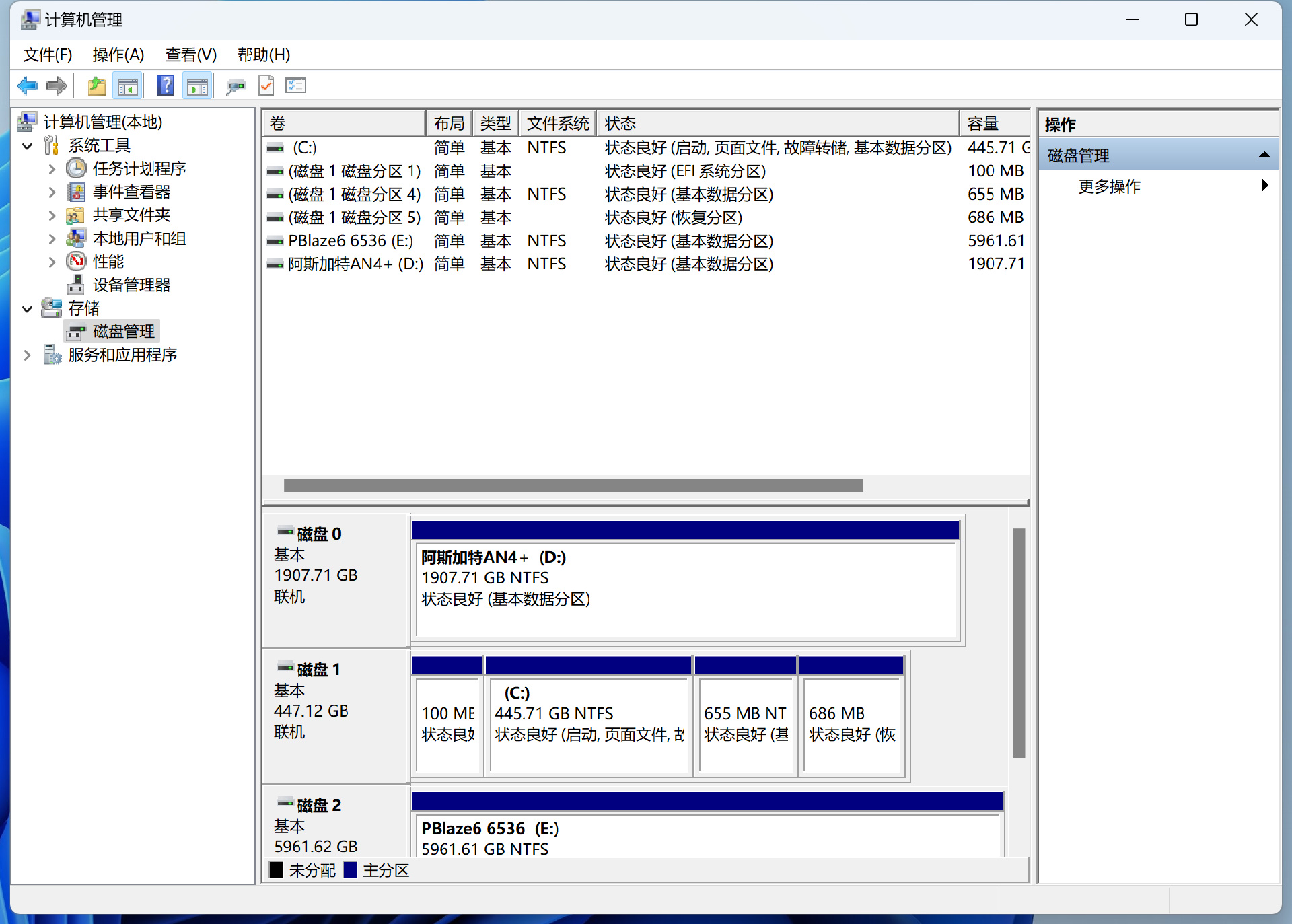 并且这块盘是足容的2048G,由于2进制与10进制的换算关系,在WIndows的磁盘管理器中可以使用的容量为1907GiB。