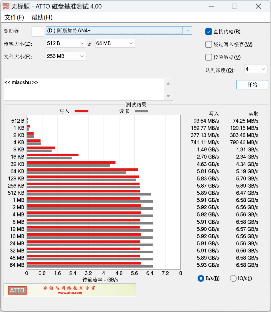 在ATTO磁盘基准测试中,可以看到阿斯加特AN4+的柱状图保持了高度一致的稳定性,没有毛病,好评。