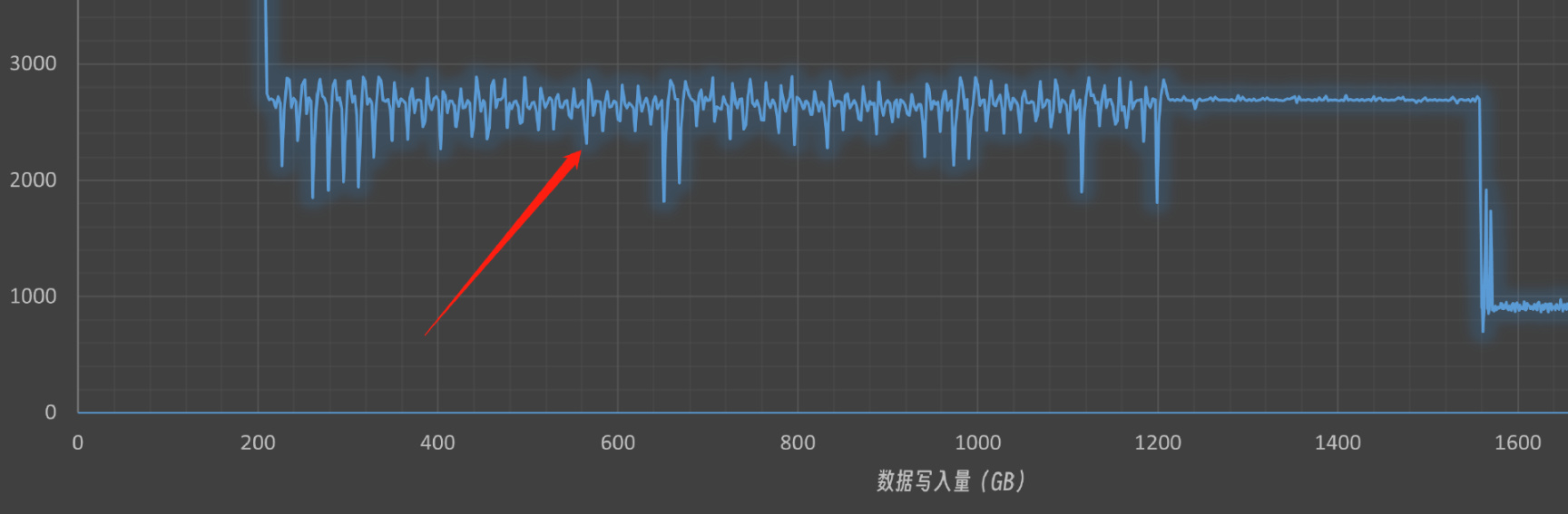 最慢的第三段曲线则是我们俗称的缓外写入速度,标志着SSD在垃圾回收阶段的表现。此时主控一边要把第一段SLC缓存重新按1:3的比例分离成TLC空间,同时还要将SLC缓内数据再次写入到这个腾出来的空间里,然后还要面对正在进行的新数据的写入,所以整体性能压力极大,速度有所降低也是在所难免的了。