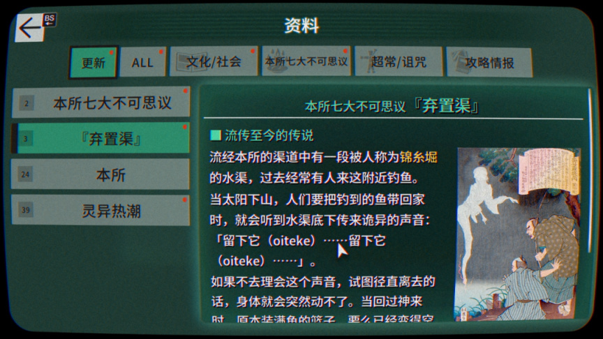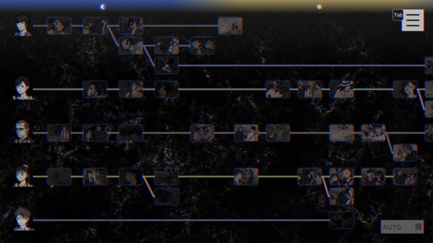 《本所七大不可思議》的流程還是相當傳統的、類似《428》的敘事模式,即,以時間爲刻度,玩家需要將所有人物的故事線都推進到這一時間段的最後,才能開始下一個時間段的內容。