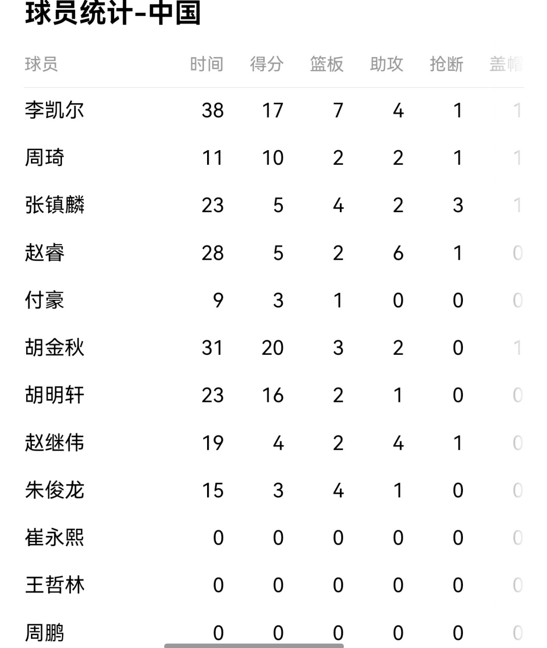 第二节比赛中,中国男篮奋起直追,与安哥拉战至45:45平,李凯尔拿下10分5篮板3助攻,胡金秋、胡明轩都拿下8分