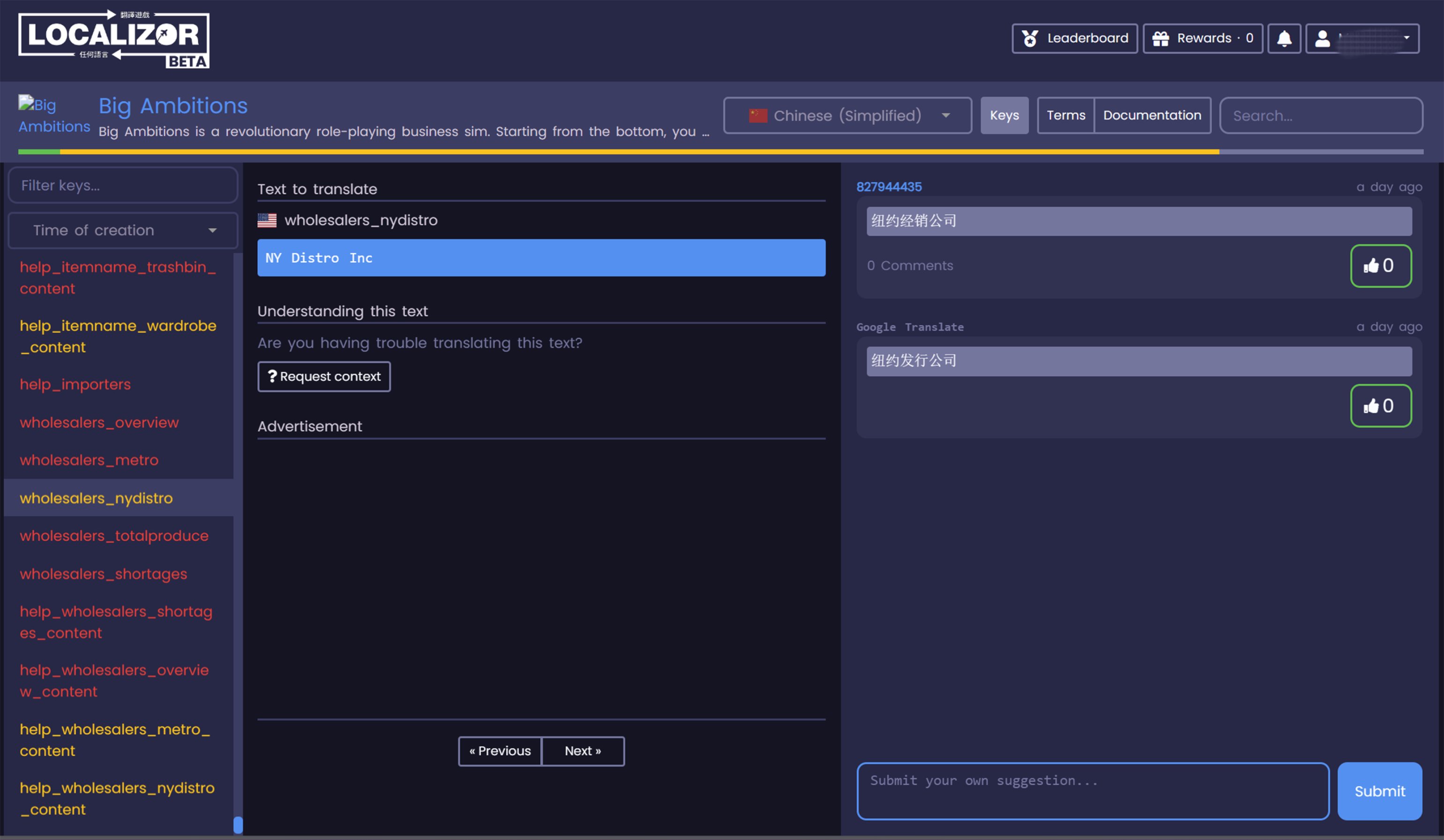 最近我非常沉迷號稱“美國版大多數”的模擬經營遊戲《雄心壯志(Big Ambition)》,遊戲哪都好就是還處在搶先體驗階段,內容少,BUG多,漢化差點意思。前兩個問題我管不着,後一個雖然問題不大,但雞蛋裏有幾個骨頭總歸不爽。於是我加了遊戲的討論組想看看開發進度,順便反饋催更。沒想到這個作者有點東西,一上來就讓我“上去自己動”,給我發了他們家基於粉絲的遊戲翻譯的平臺 Localizor。