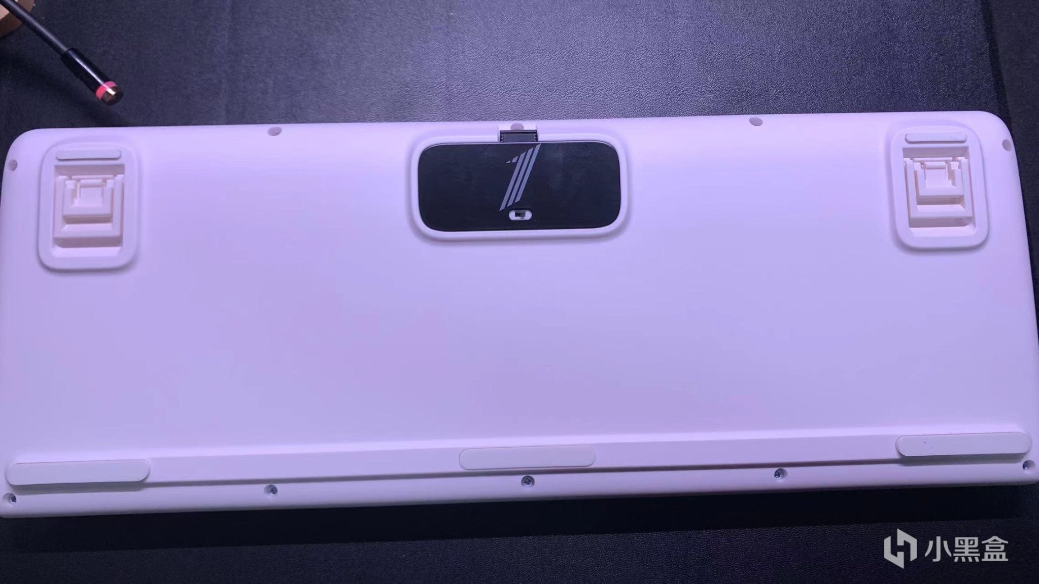 键盘的背面其实很简单,就是一个两段式的可调脚撑,一个开关,一个贴片以及四个防滑脚贴