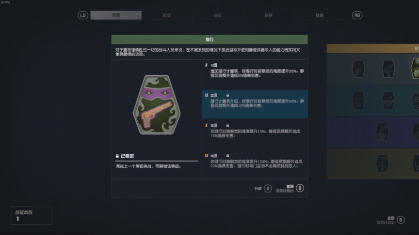要升级技能可不是只要有技能点就可以,游戏有技能熟练度系统,点亮技能之后,需要完成技能所需的挑战才能解锁下一级。例如潜行技能,就要求玩家偷袭敌人达到一定次数才能继续升级。