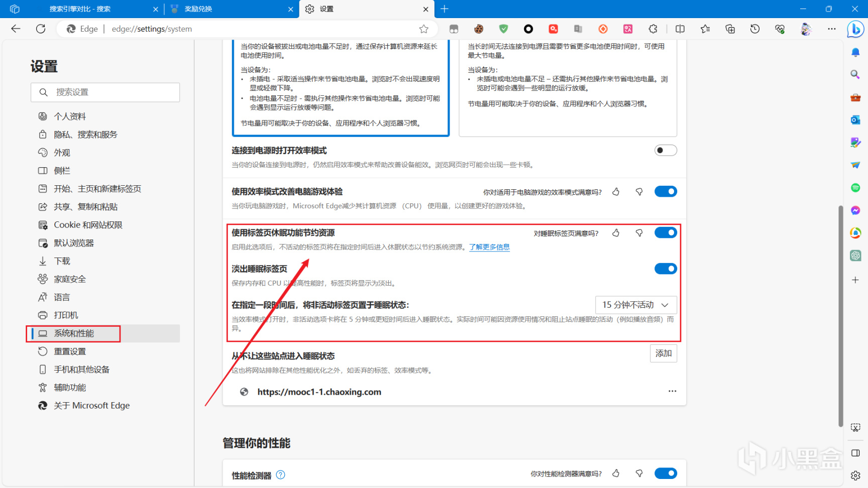 說到爲啥Edge的內存佔用比chrome的少,就不得不說其中一個功能了,在設置裏面的系統和性能中有一個,使用標籤頁休眠功能節約資源這個功能,打開之後,如果你沒有看這個網頁,過一段時間後,它會自動給你休眠掉這個網頁很好用,例如你打開20多個網頁,但是能瀏覽到的可能只有5個,其餘的如果關閉,之後要看,但是如果開啓又要佔用資源,Edge的這個功能是非常好用的