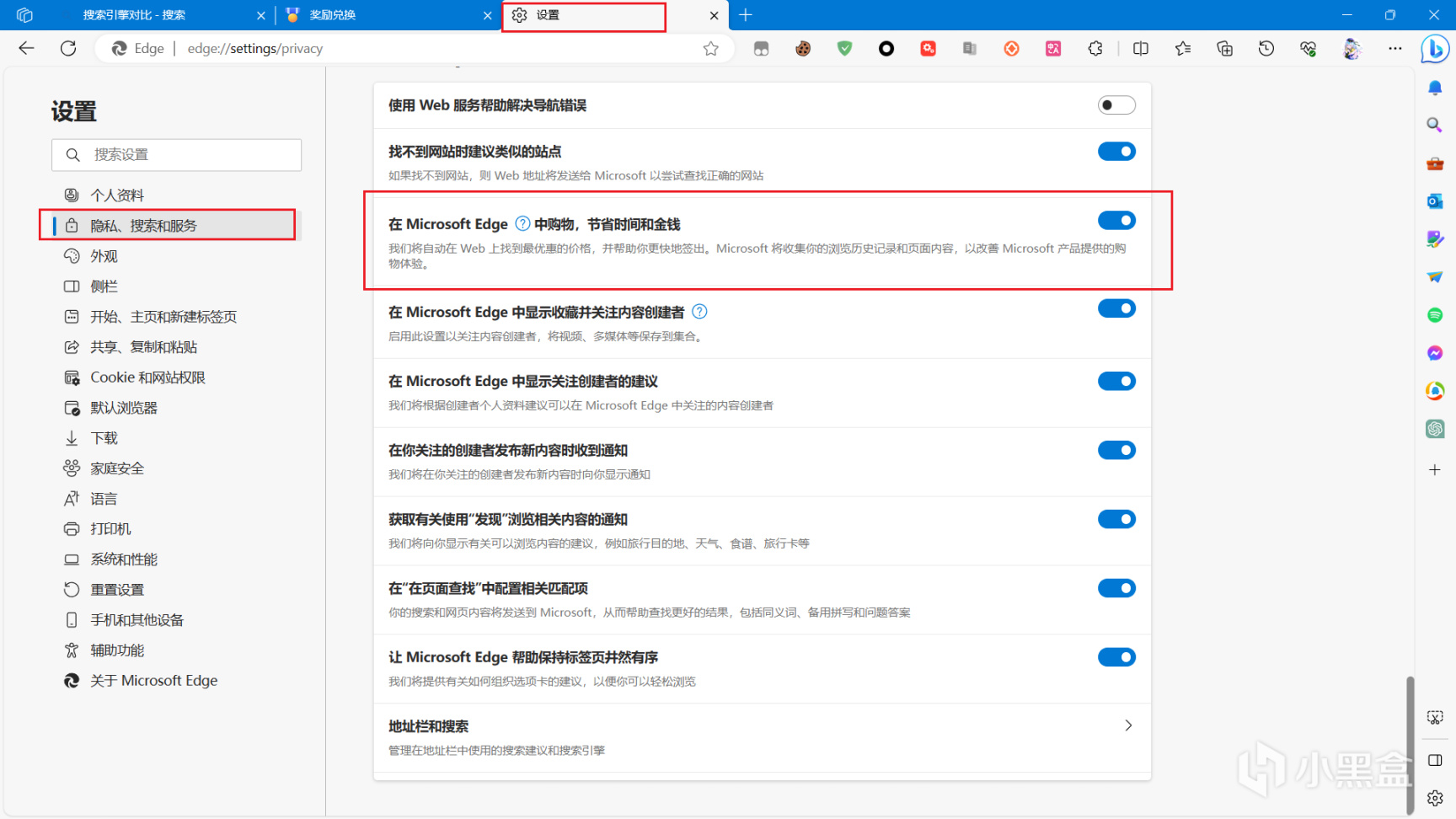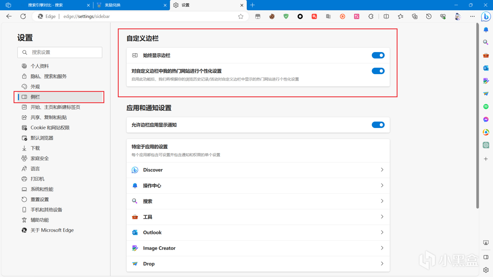 側邊欄這一塊我用的不多,主要應用爲使用bingAi,而且主要是筆記本屏幕太小了,本來瀏覽就覺得很小,在加上一塊感覺跟小了,大家可以自行體驗一番 在這個設置中也可以關閉很多不想要的東西,比如bingAi,之前好多人想要關閉它,也可以自行添加自己想要的網頁