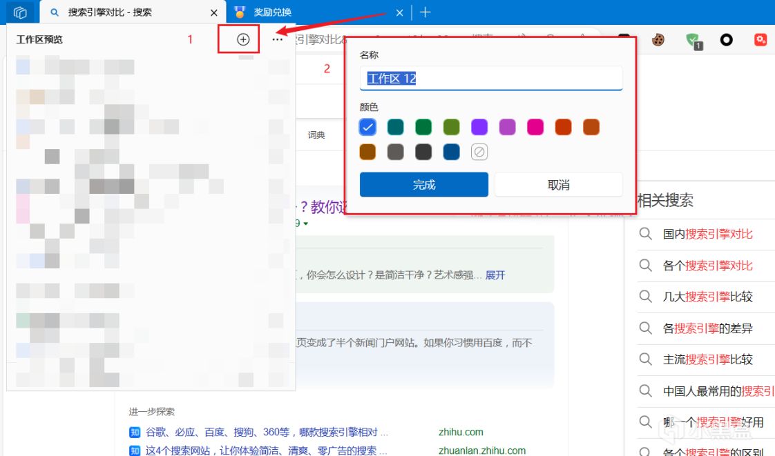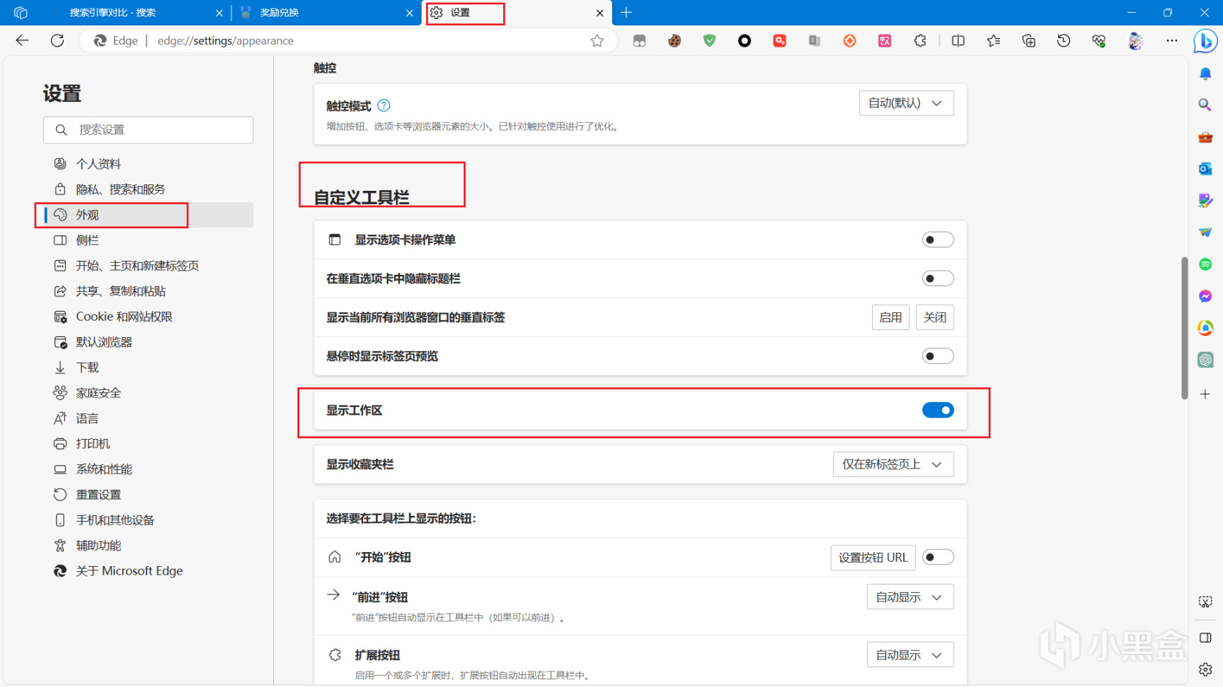 工作區是最近的新功能,我是用來代替集錦,比之前的集錦好用一些,同時搭配組的功能,會很方便的去瀏覽網頁 工作區是在最左上角,如果沒有的話可以去設置中,外觀,然後找到自定義工具欄這一項中,有個顯示工作區,打開即可在左上角找到