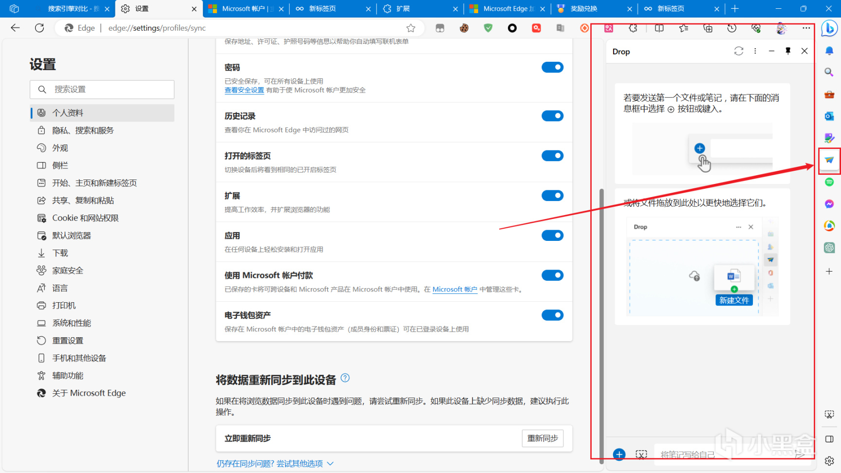 同時多端進行登錄還可以使用微軟的文件傳輸,叫drop,在側邊欄打開